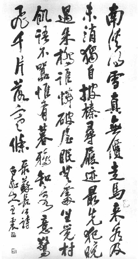 释文:南溪得雪真无价,走马来看及未消。独自披榛寻履迹,最先犯晓过朱桥。 谁怜屋破眠无处,坐觉村饥语不嚣。惟有暮鸦知客意,惊飞千片落寒条。 款识:录苏长公诗,白龙山人王震。