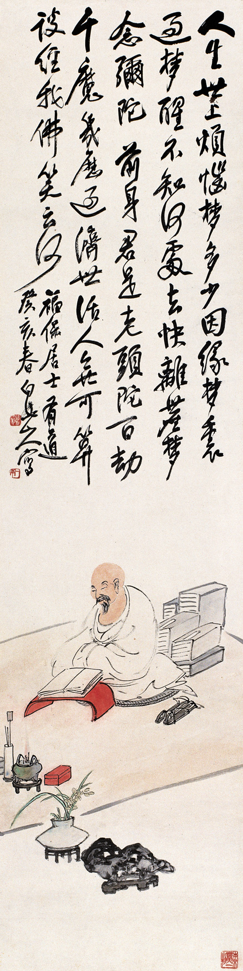 款识:人生世上烦恼梦,多少因缘梦里过。梦醒不知何处去,快离尘梦念弥陀。前身君是老头陀,百劫千魔几历过,济世活人无可算,谈经我佛笑云何。福保居士有道。癸亥(1923年)春,白龙山人写。