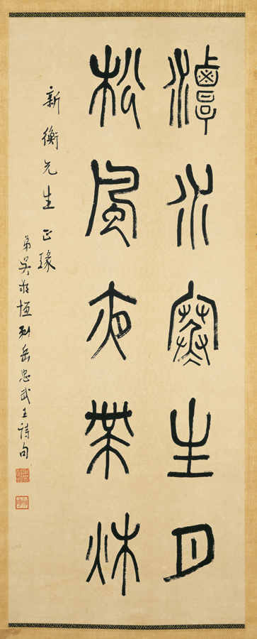 字稚晖,江苏武进人。早年追随中山先生致力革命救国工作,民国成立后,持续参与建国行列,众所周知莫过于审定注音符号,推行国语,奠定国家长远发展的基础。这两行诗句:“潭水寒生月,松风夜带秋”,是南宋抗金名将岳飞的诗作,文中冷月松风,一片夜凉清寂的意境。吴敬恒写来圆笔方笔兼用,转折自然,别具篆书清劲的韵味。本幅为王新衡先生捐赠予台北故宫博物院。