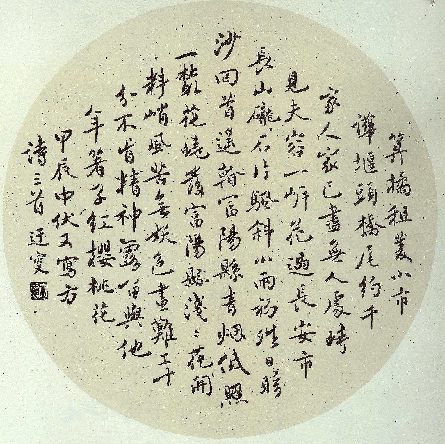 吴玉如《行书录宋方回诗三首扇》 1964年作 释文:算橘租菱小市哗,堰头桥尾约千家。 人家已尽无人处,时见夫容一岸花。过长安市。 长山陇石片帆斜,小雨初晴日眩沙。 回首遥看富阳县,青烟低照一丛花。 晓发富阳县。 浅浅花开料峭风,苦无妖色画难工。 十分不肯精神露,留与他年著子红。樱桃花。 款识:甲辰中伏,又写方诗三首。迂叟。 【资料来源】《吴玉如书法集》(天津人民美术出版社)