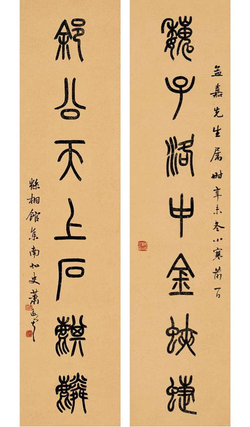 蕭蛻菴,名嶙,字中孚,号蜕闇,喜禅悦,法名慧脱、本无等,江苏常熟人,著名文字学家、书法家。萧蜕出身医道世家,曾任上海中医公会副会长、爱国女学校长,萧蜕能诗善文,博通经史小学,酷嗜书法,一生固守清贫,视功名如粪土。先后参加同盟会和南社,有志于国民革命。1931年(辛未)萧蜕送给王骥一副颇有特色的篆书对联: