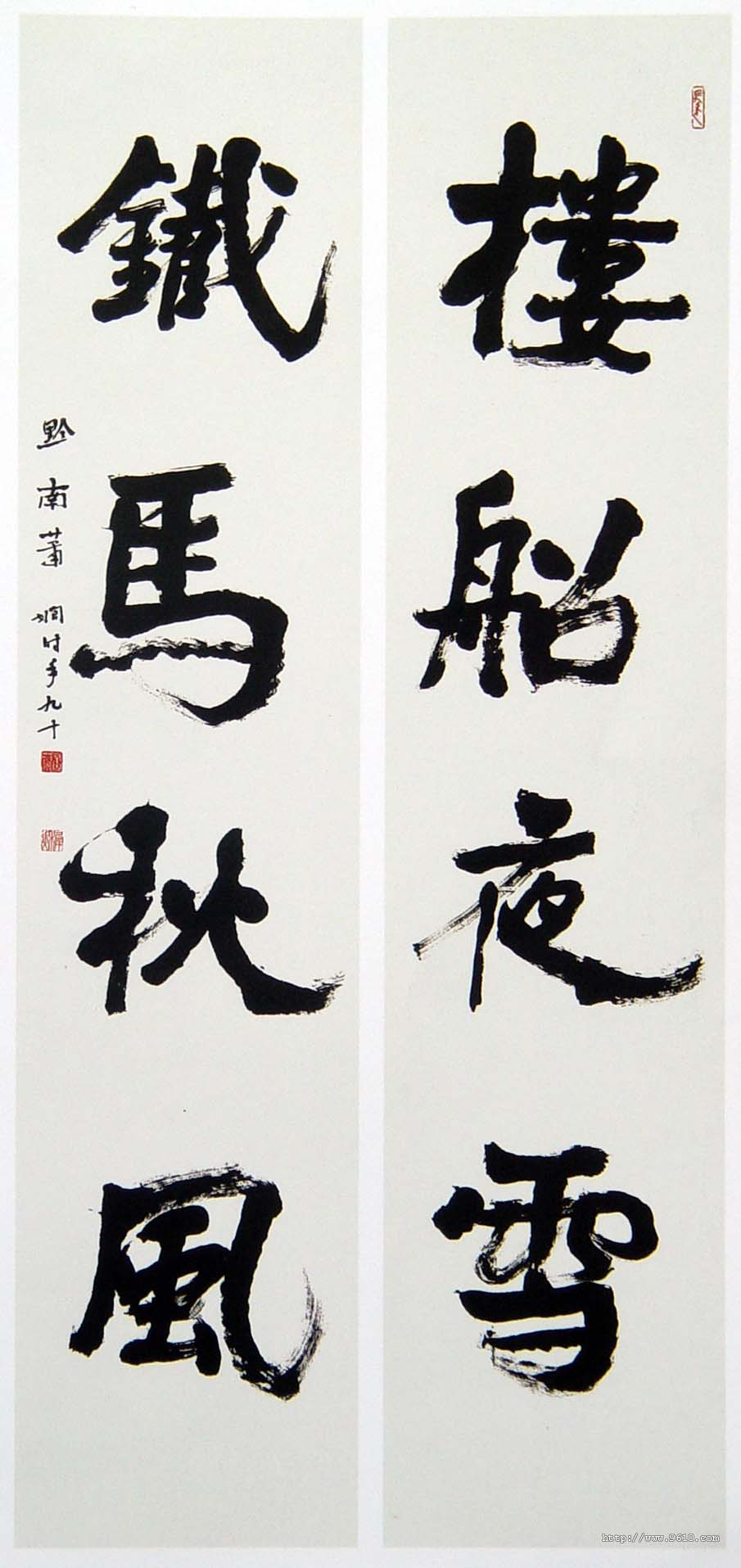 释文:楼船夜雪,铁马秋风。 款署:黔南萧娴。时年九十。 钤印:长寿(朱) 稺秋(朱) 萧娴(白)