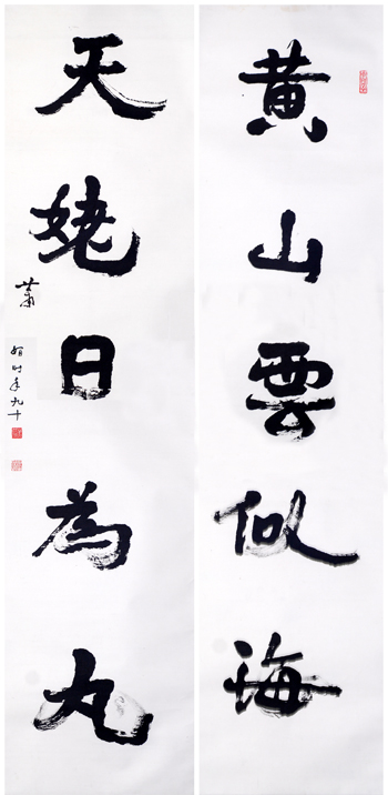 萧娴《黄山天姥五言联》 1991年 南京求雨山文化名人纪念馆(萧娴馆)藏 释文:黄山云似海 天姥日为丸。 款署:萧娴时年九十 钤印:枕琴室(朱) 稺秋(朱) 萧娴(白)
