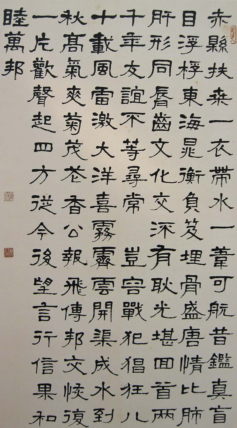 释文:赤县扶桑,一衣带水,一苇可航。 昔鉴真盲目,浮桴东海,晁衡负笈,埋骨盛唐。 情比肺肝,形同唇齿,文化交流有耿光。 堪回想,两千年友谊,不同寻常。 岂容战犯猖狂,八十载风雷激大洋。 喜雾霁云开,渠成水到,秋高气爽,菊茂花香; 公报飞传,邦交恢复,一片欢声起四方。 从今后,望言行信果,和睦万邦。 款署:无 钤印:稚秋(朱)、萧娴(白)、长寿(朱)