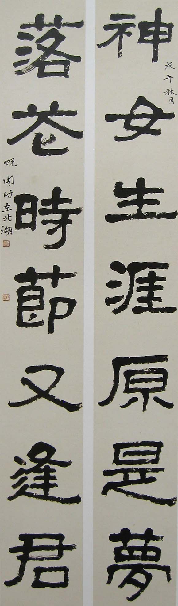 萧娴《隶书神女落花七言联》128×18cm ×2 1978年 南京求雨山文化名人纪念馆(萧娴馆) 藏