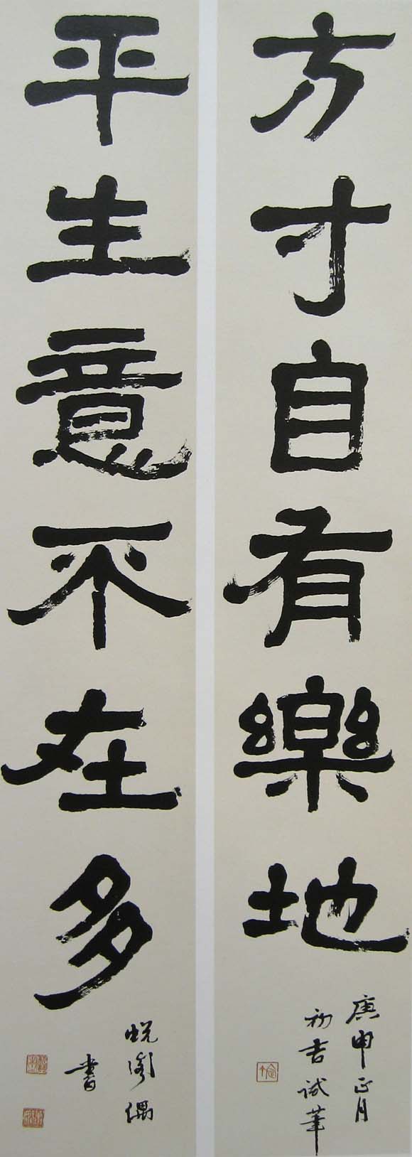 释文: 方寸自有乐地 ,平生意不在多。 款署:庚申正月初吉试笔 蜕阁偶书。 钤印:枕琴室主(朱) 萧娴(白)庖丁(朱)