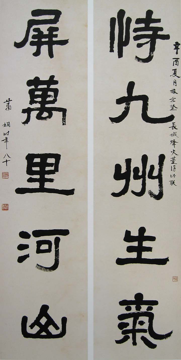 释文: 恃九州生气,屏万里河山。 款署:辛酉夏月旅京登长城烽火台得此联。萧娴时年八十。 钤印:庖丁(朱) 萧娴(白)蜕阁(朱)