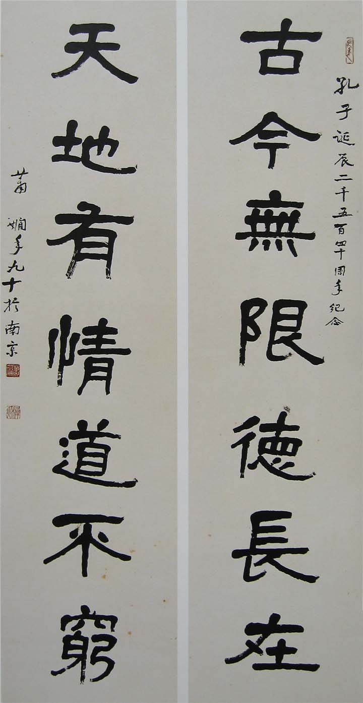 释文: 古今无限德长在,天地有情道不穷。 款署:孔子诞辰二千五百四十周年纪念,萧娴年九十于南京。 钤印:萧娴(白) 长寿(朱) 稺秋(朱)