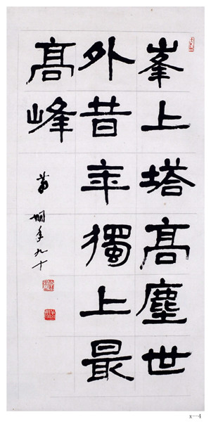 萧娴《隶书峰上塔高句轴》 1991年 南京求雨山文化名人纪念馆(萧娴馆)藏 释文:峰上塔高尘世外,昔年独上最高峰。 款署:萧娴年九十。 钤印:枕琴室主(朱) 萧娴(白) 大寿(朱)