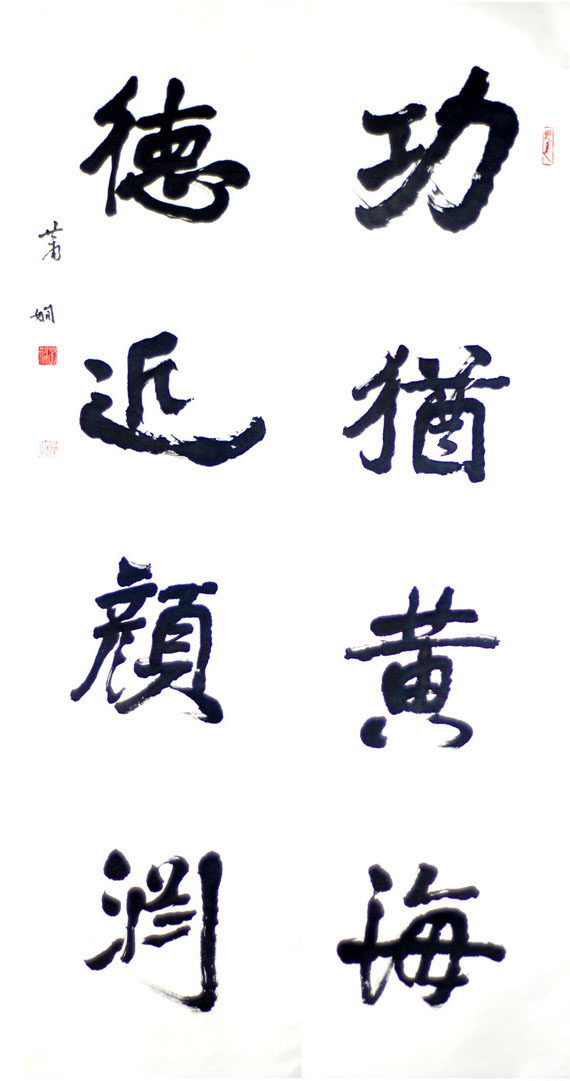 萧娴《功犹德近四言联》 南京求雨山文化名人纪念馆(萧娴馆)藏 释文:功犹黄海,德近颜渊。 款署:萧娴。 钤印:长寿(朱) 萧娴(白) 稺秋(朱)