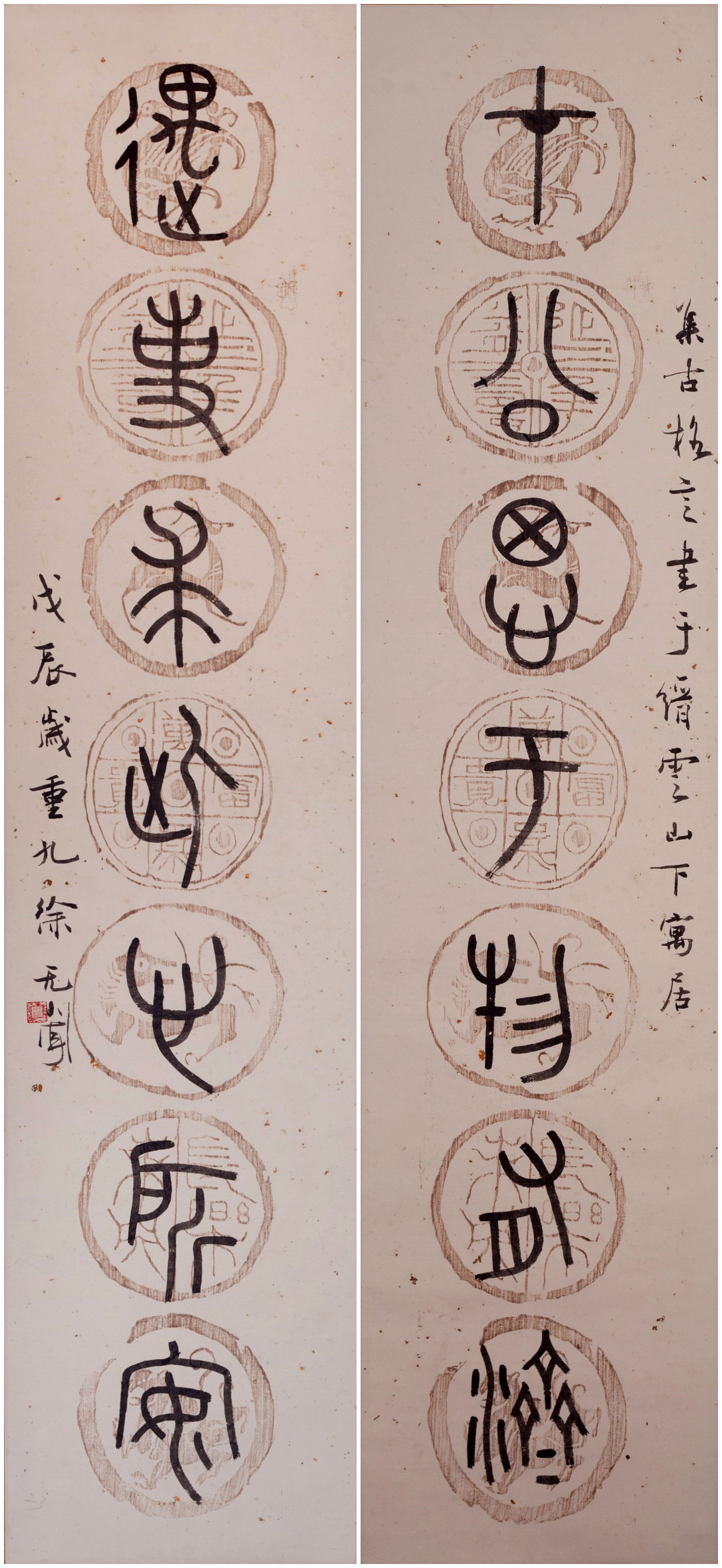 徐无闻《大篆在公遇事七言联》 122×28cm×2 1988年 私人收藏