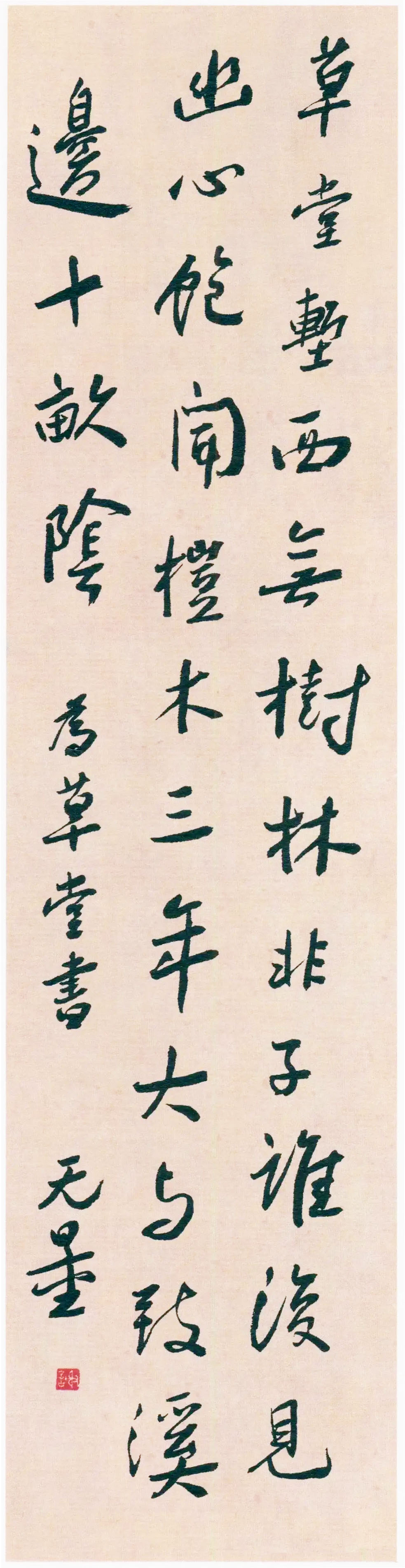 释文:草堂堑西无树林,非子谁复见幽心。饱闻桤木三年大,与致溪边十亩阴。 款识:为草堂书。无量 钤印:谢(白文) 这件行书朴拙而典雅,从容而潇洒,天真烂漫,不计工巧。笔笔中锋,笔势见方。结字高古,向右上方倾斜。字距、行距较大,字字断开,极具文人书卷气。