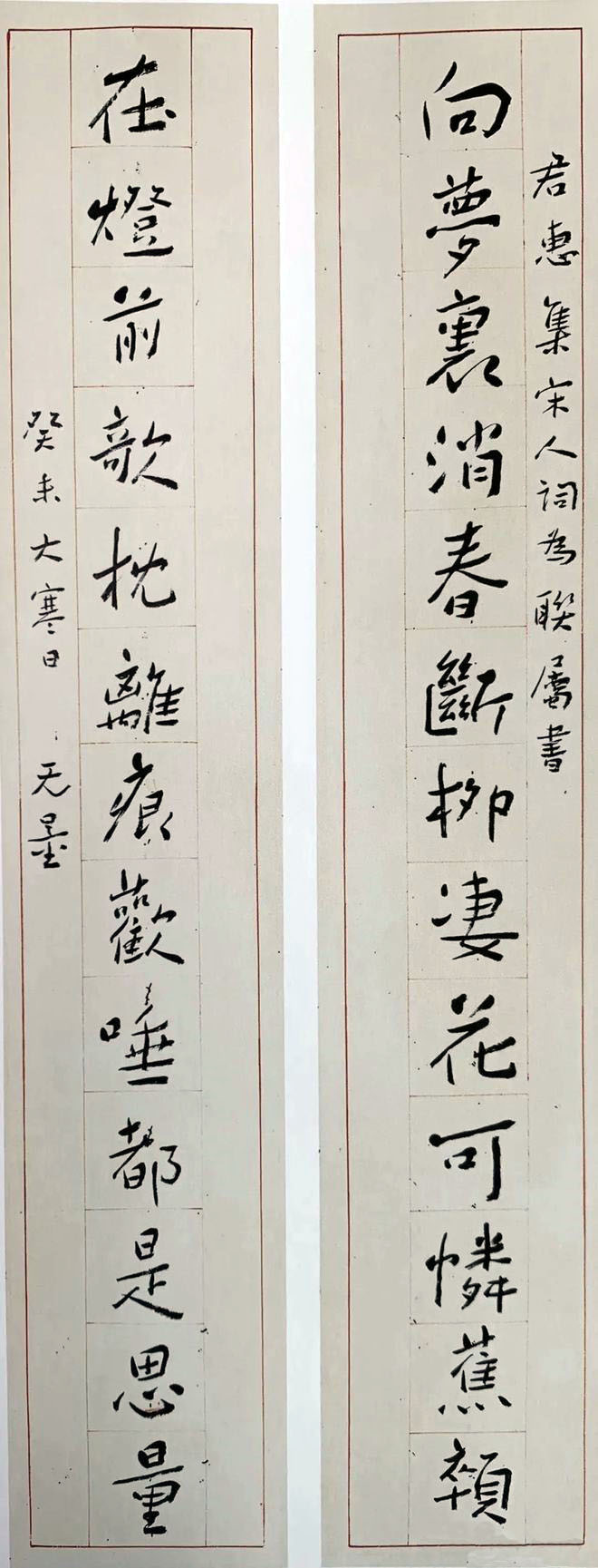 释文:向梦里消春,断柳凄花,可怜蕉悴;在灯前欹枕,离痕欢唾,都是思量。 款识:君惠集宋人词为联,属书。癸未大寒(1944年1月)日。无量。