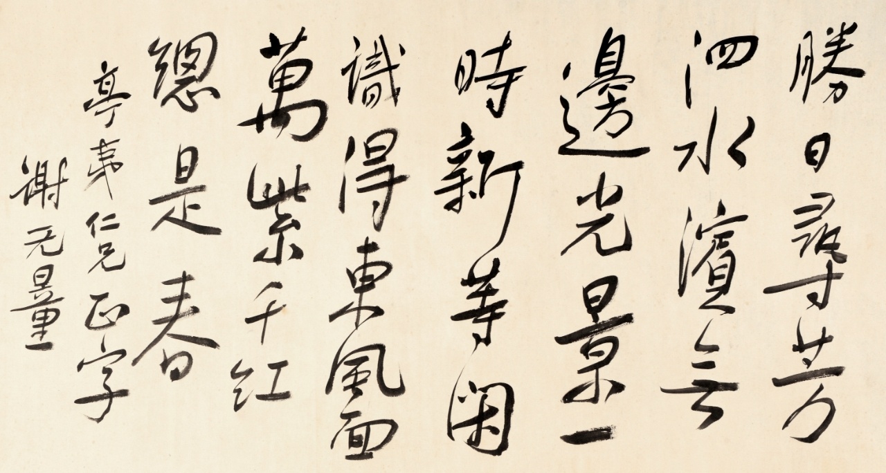 释文: 胜日寻芳泗水滨,无边光景一时新。等闲识得东风面,万紫千红总是春。 款识:亭夷仁兄正字。谢无量。