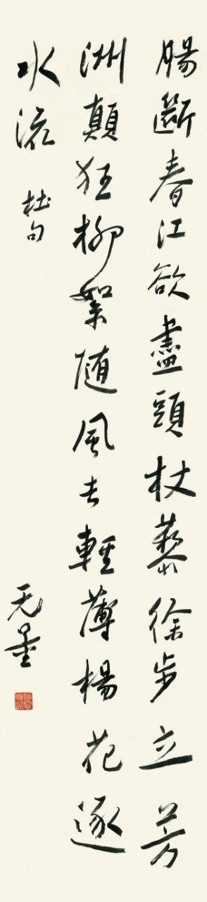 释文: 肠断春江欲尽头,杖藜徐步立芳洲。 颠狂柳絮随风去,轻薄桃花逐水流。 款识:杜句。无量。