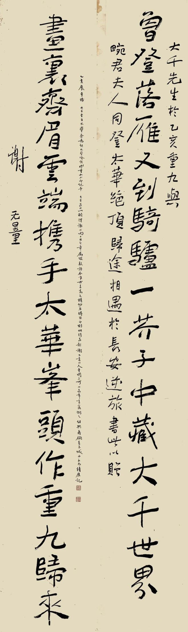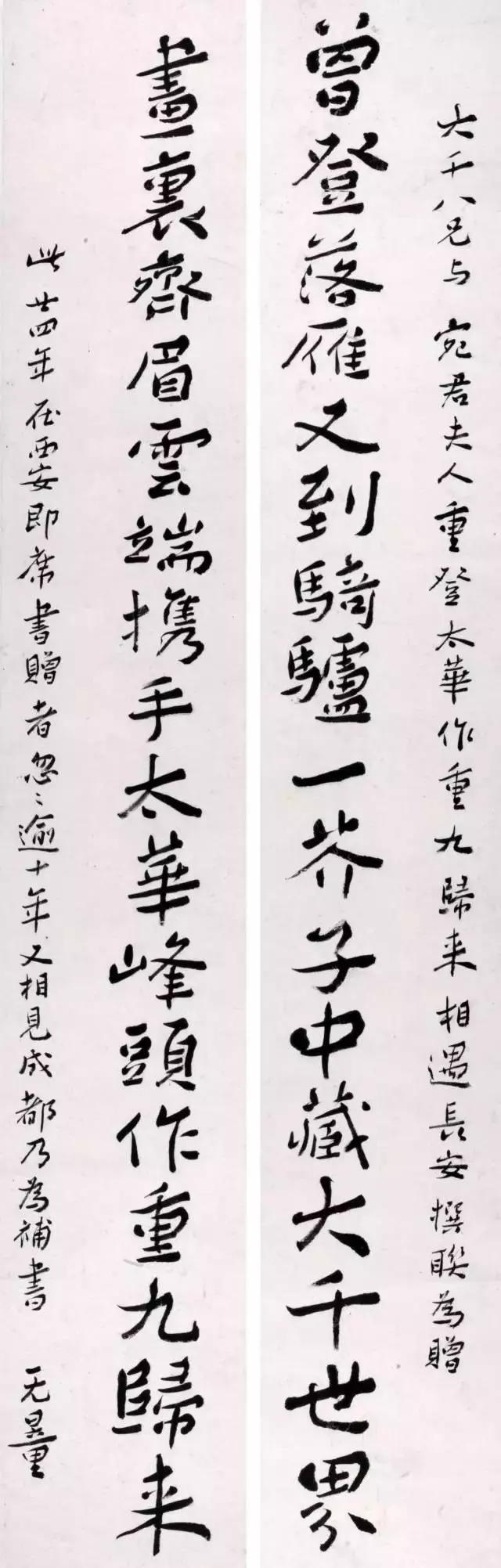 释文:曾登落雁,又到骑驴,一芥子中藏大千世界;画里齐眉,云端携手,太华峰头作重九归来。 款识:大千八兄与宛君夫人重登太华作,重九归来相遇长安,撰联为赠。此廿四年在西安即席书赠者,忽忽逾十年又相见成都,乃为补书。无量。