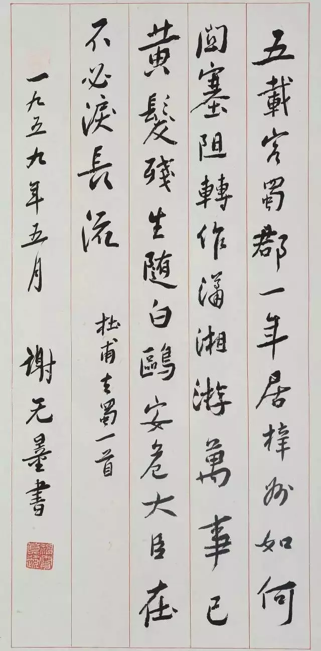 释文:五载客蜀郡,一年居梓州。 如何关塞阻,转作潇湘游。 万事已黄发,残生随白鸥。 安危大臣在,不必泪长流。 款识:杜甫去蜀一首,一九五九年五月,谢无量书。 钤印:神霄真逸(白文)