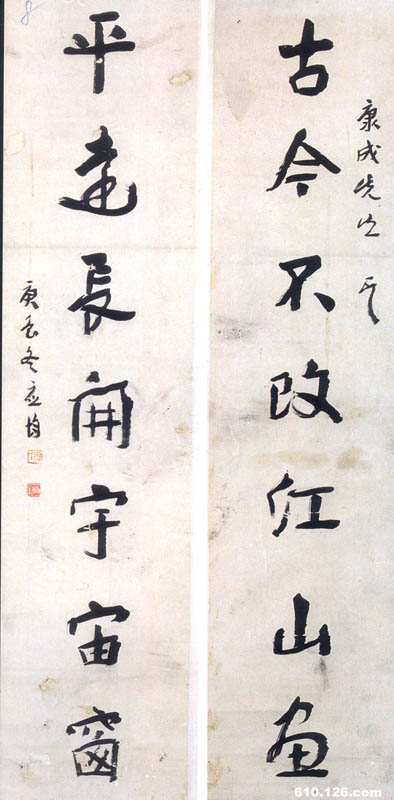释文:古今不改江山画,平远长开宇宙窗。 款署:康成先生正之,庚辰冬应均。