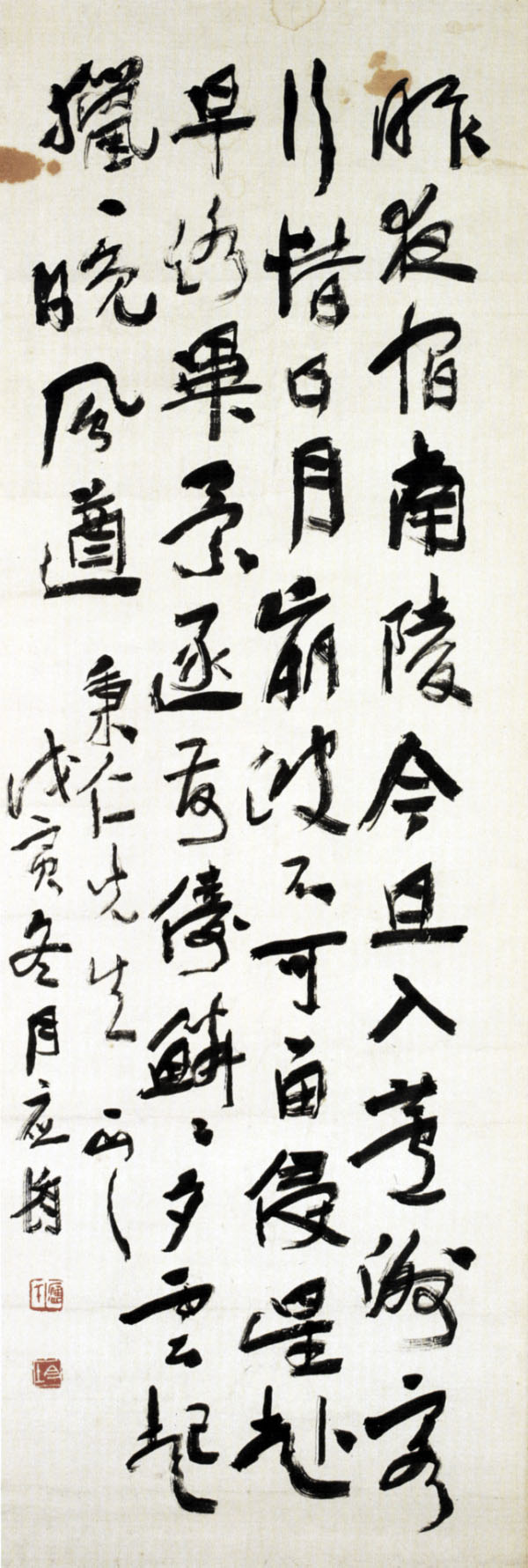 释文:昨夜宿南陵,今旦入芦洲。客行惜日月,崩波不可留。侵星赴早路,毕景逐前俦。鳞鳞夕云起,猎猎晚风遒。 款署:秉仁先生正之,戊寅冬月,应均。