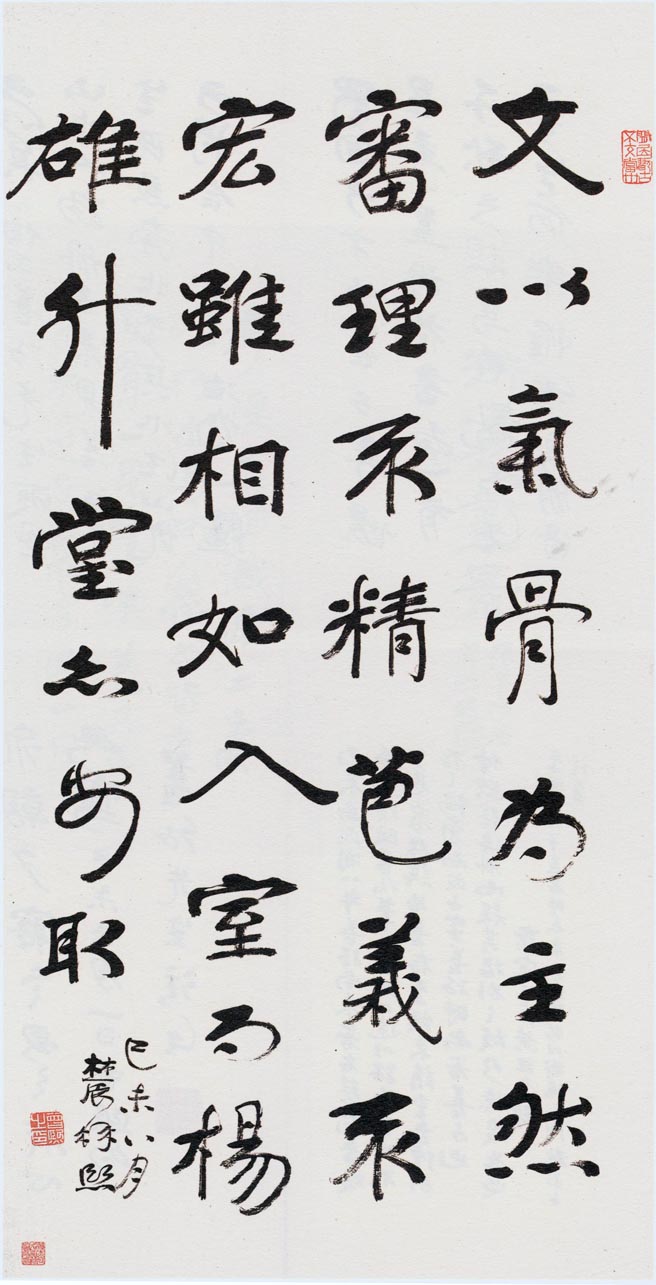 释文:文以气骨为主,然审理不精,苞义不宏,虽相如入室而杨雄升堂亦安取! 款识:己未八月,辳髯熙。 钤印:曾熙之印(白文)、闲居玩古不交当世(朱文)