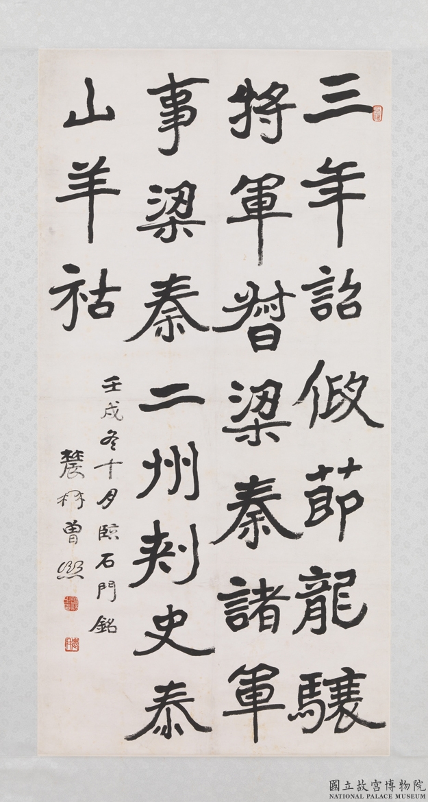 曾熙《节临石门铭轴》纸本楷书 129.8×64.9cm 1922年作 台北故宫博物院藏 释文:三年詔假節龍驤將軍督梁秦諸軍事梁秦二州刺史泰山羊祜。 款识:壬戌冬十月臨石門銘。辳髯曾熙。 钤印:曾熙之印、辳髯、烝陽