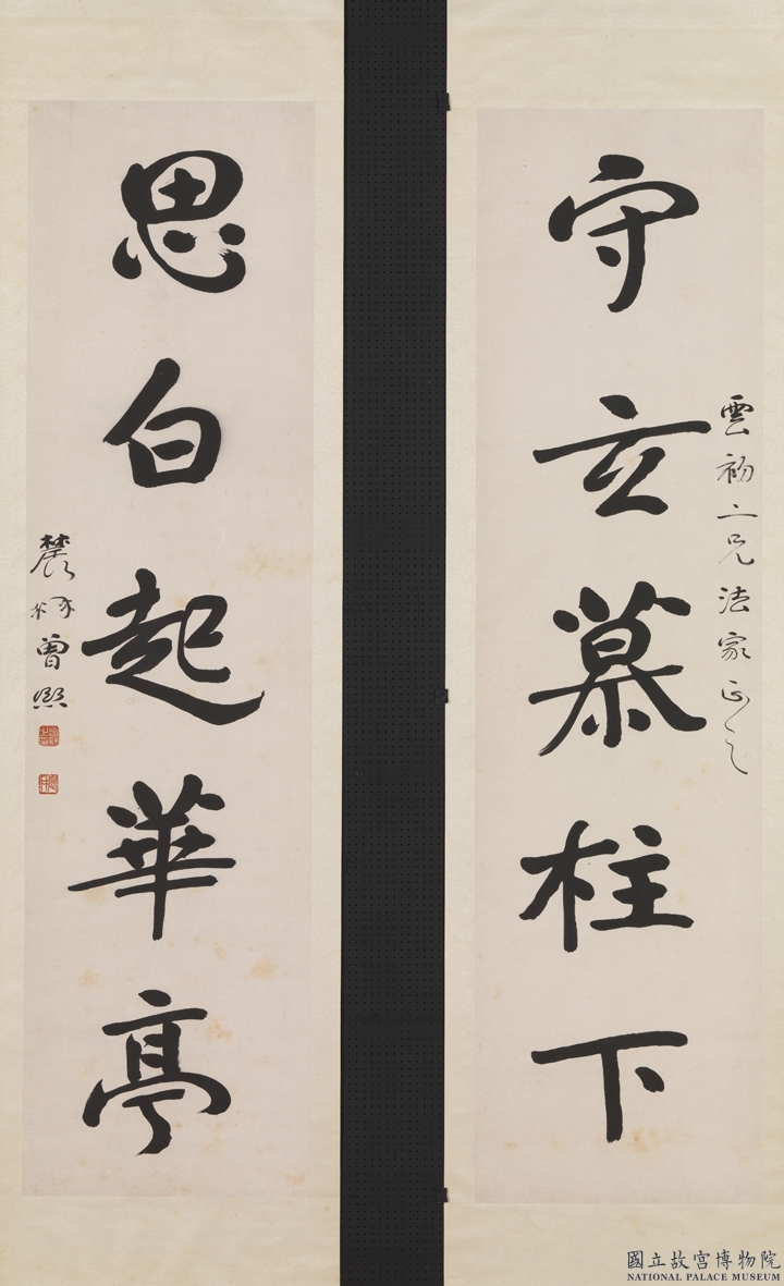 曾熙《楷书守玄思白五言联》纸本楷书 145.6×38cm×2 1922年作 台北故宫博物院藏 释文:守玄慕柱下。思白起華亭。 款识:雲初二兄法家正之。辳髯曾熙。 钤印:曾熙之印、辳髯