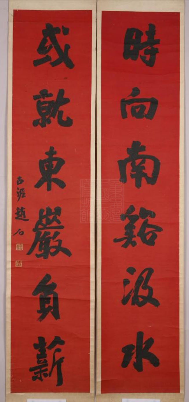 赵古泥《行书时向或就六言联》洒金笺 纵199,横40.5 重庆中国三峡博物院藏