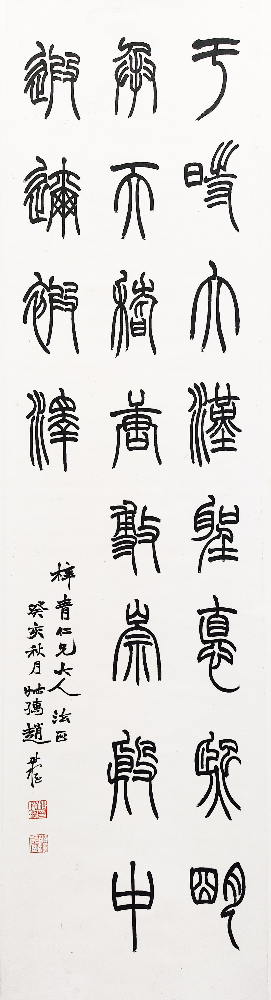 赵时棡等《篆隶真草四条屏之篆书轴》纸本 131.0×33.0cm 湖州市博物馆藏 释文:于时大汉,圣德熙明,承天稽唐,敷崇殷中,遐迩被泽。 款署:梓青仁兄大人法正。癸亥秋月,叔孺赵时棡。 钤印:赵时棡印(白文)、皕汉镜室(白文)