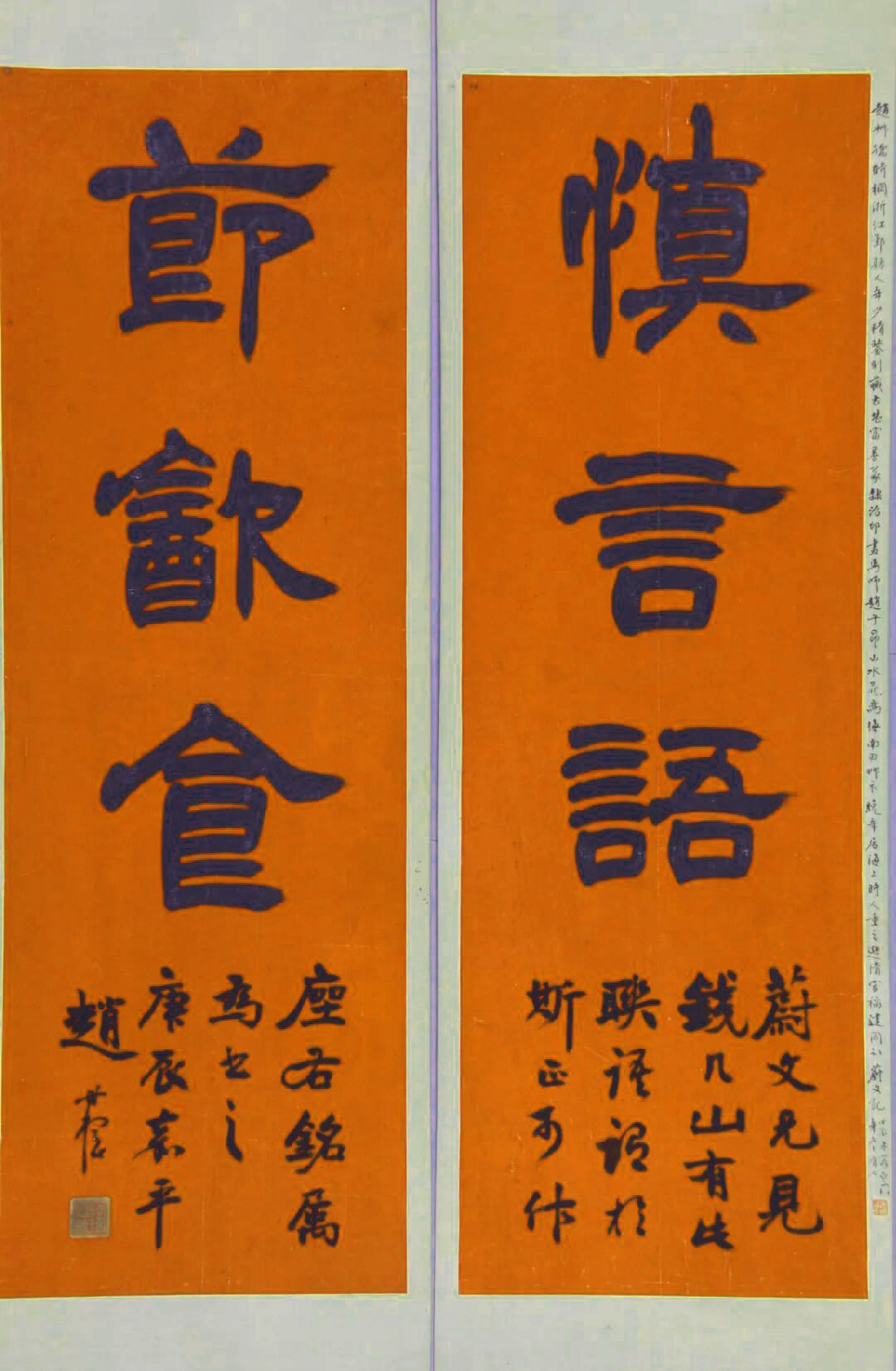 赵时棡《赠沈炳儒隶书三言联》纸本 78×26cm×2 浙江省博物馆藏 释文:慎言语,节饮食。 款识:蔚文兄见钱几山有此联语,谓于正可作座右铭,属书之。庚辰嘉平,赵时棡。