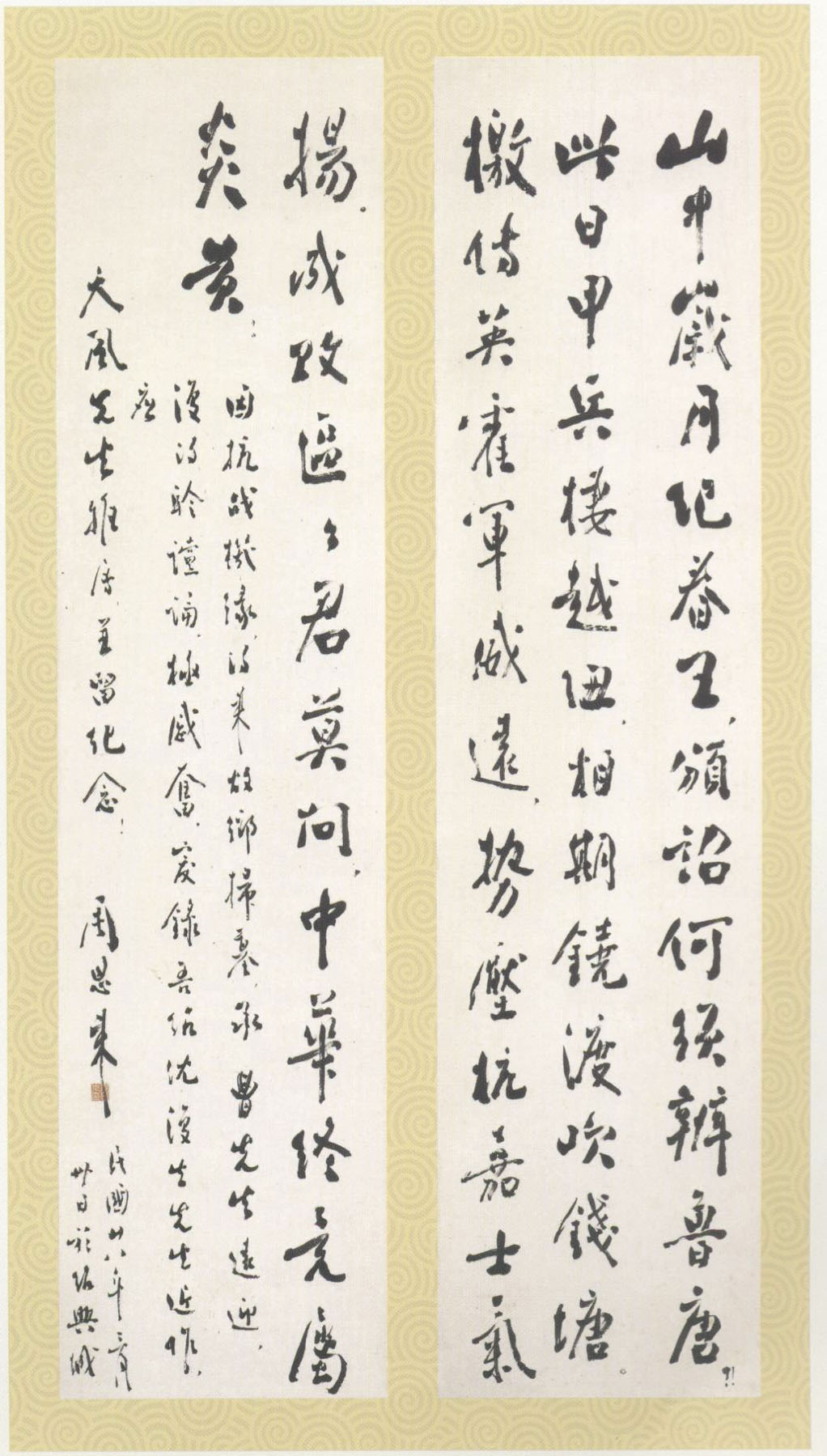 浙江省博物馆收藏有一幅周恩来行书墨迹——《 周恩来同志赠曹天风先生行书联》,为1939年3月周恩来赴浙视察抗战,在访绍期间赠给《战旗》杂志主编曹天风,现为国家一级文物。“成败区区君莫问 , 中华终竟属炎黄”是周恩来所录诗的最后一句, 是整首诗的点睛之笔, 也是直接针对现实的警语。