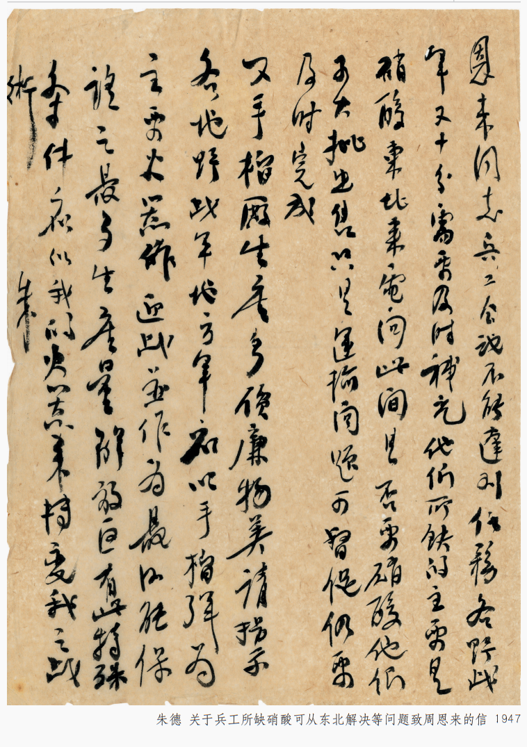 朱德 《关于兵工所缺硝酸可从东北解决等问题致周恩来的信 》 一九四七年