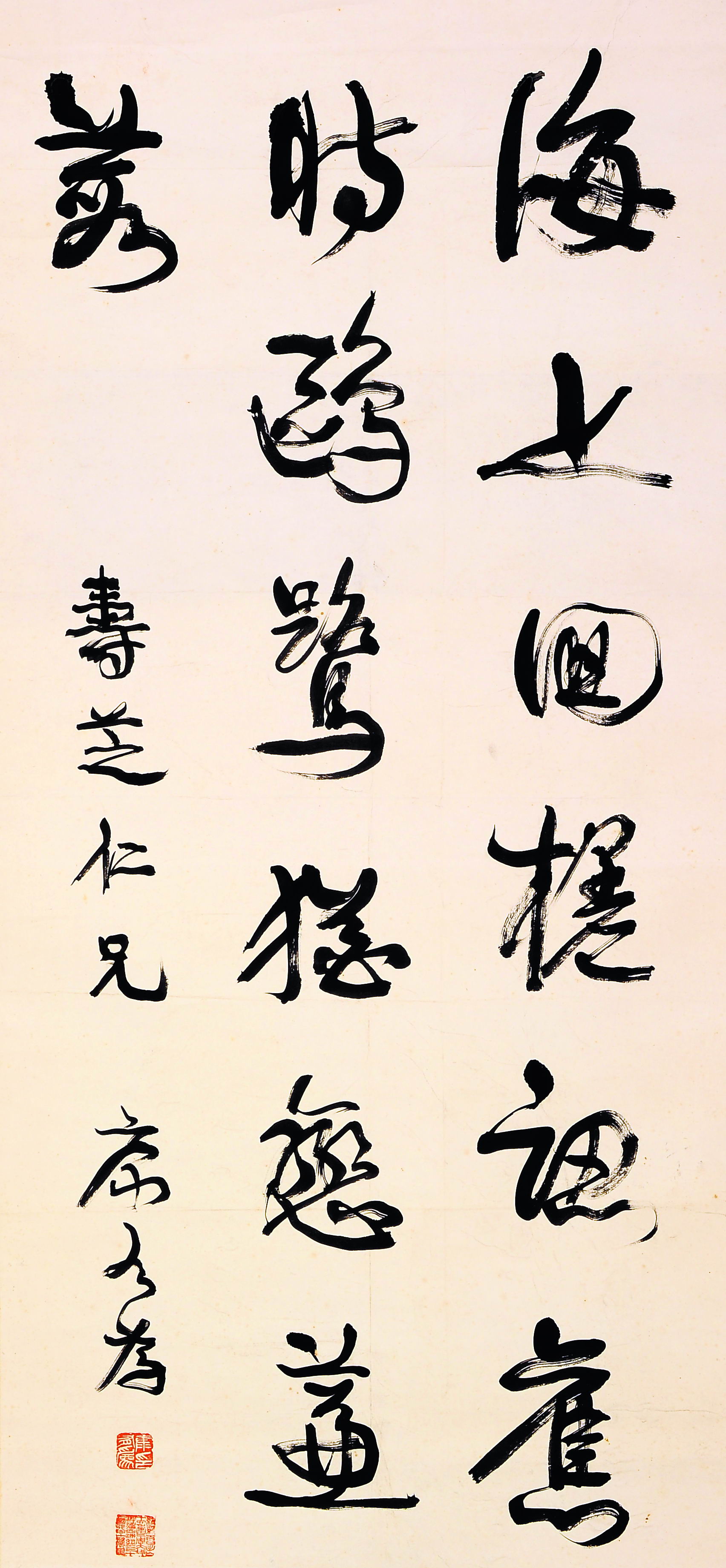 康有为《行书海上回槎中堂》 纸本行书 133.5cm×61.5cm 释文:海上回槎,认旧时鸥鹭,犹恋蒹葭。 题识:寿芝仁兄。康有为。 钤印:康有为印(白文)、维新百日出亡十六年三周大地游遍四洲经三十一国行六十万里(朱文 出版:《天马行空——康有为墨迹精品》,荣宝斋青岛经销店,2010年8月出版。 展览:《天马行空——康有为墨迹精品展》,青岛康有为故居,2010年9月1日-10月7日
