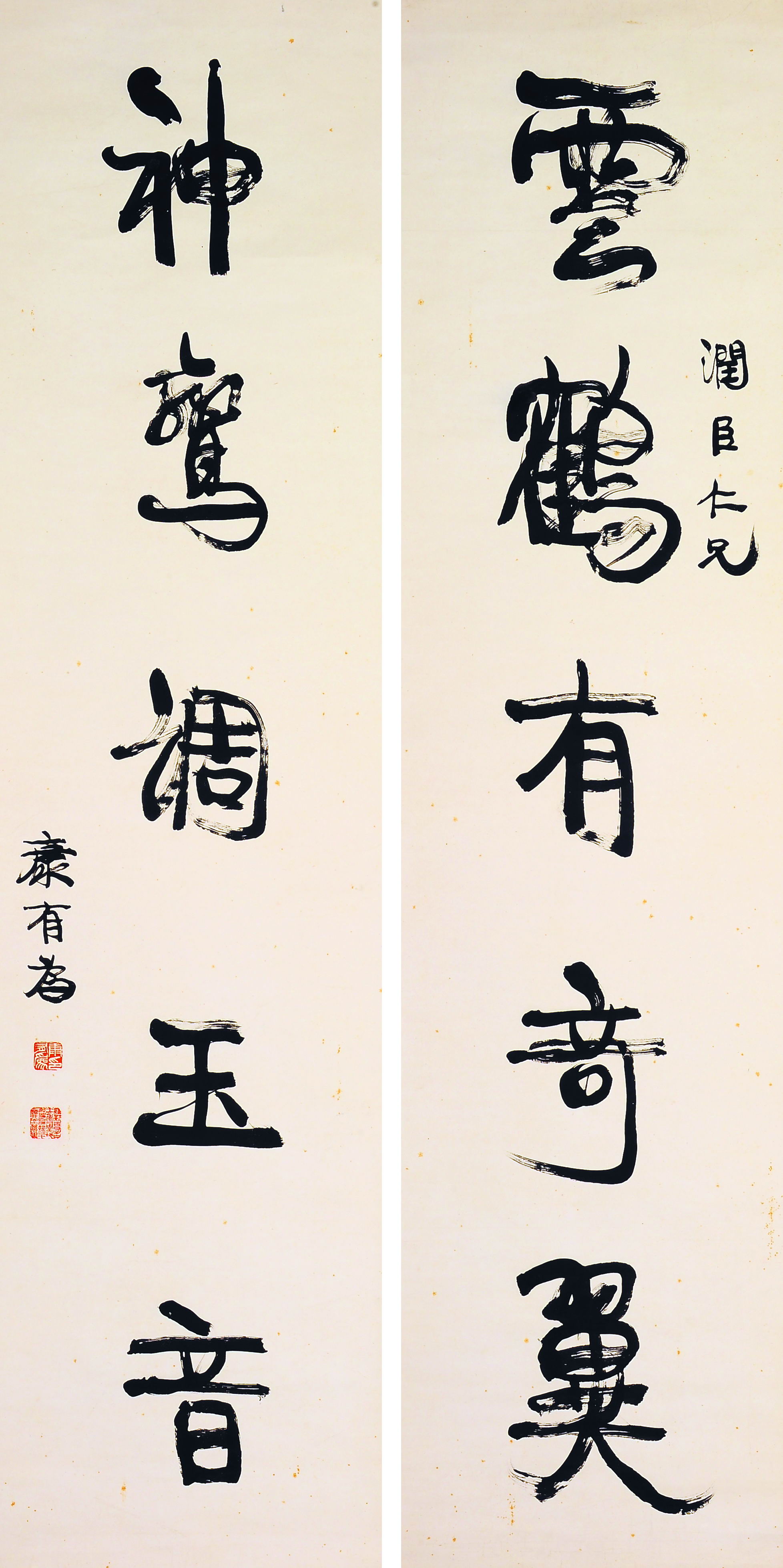 康有为《行书云鹤神鸾五言联立轴》 纸本行书 170cm×43cm×2 释文:云鹤有奇翼,神鸾调玉音。 题识:润臣仁兄,康有为。 钤印:康有为印(白文)、维新百日出亡十六年三周大地游遍四洲经三十一国行六十万里(朱文) 出版:《天马行空——康有为墨迹精品》,荣宝斋青岛经销店,2010年8月出版。 展览:《天马行空——康有为墨迹精品展》,青岛康有为故居,2010年9月1日-10月7日