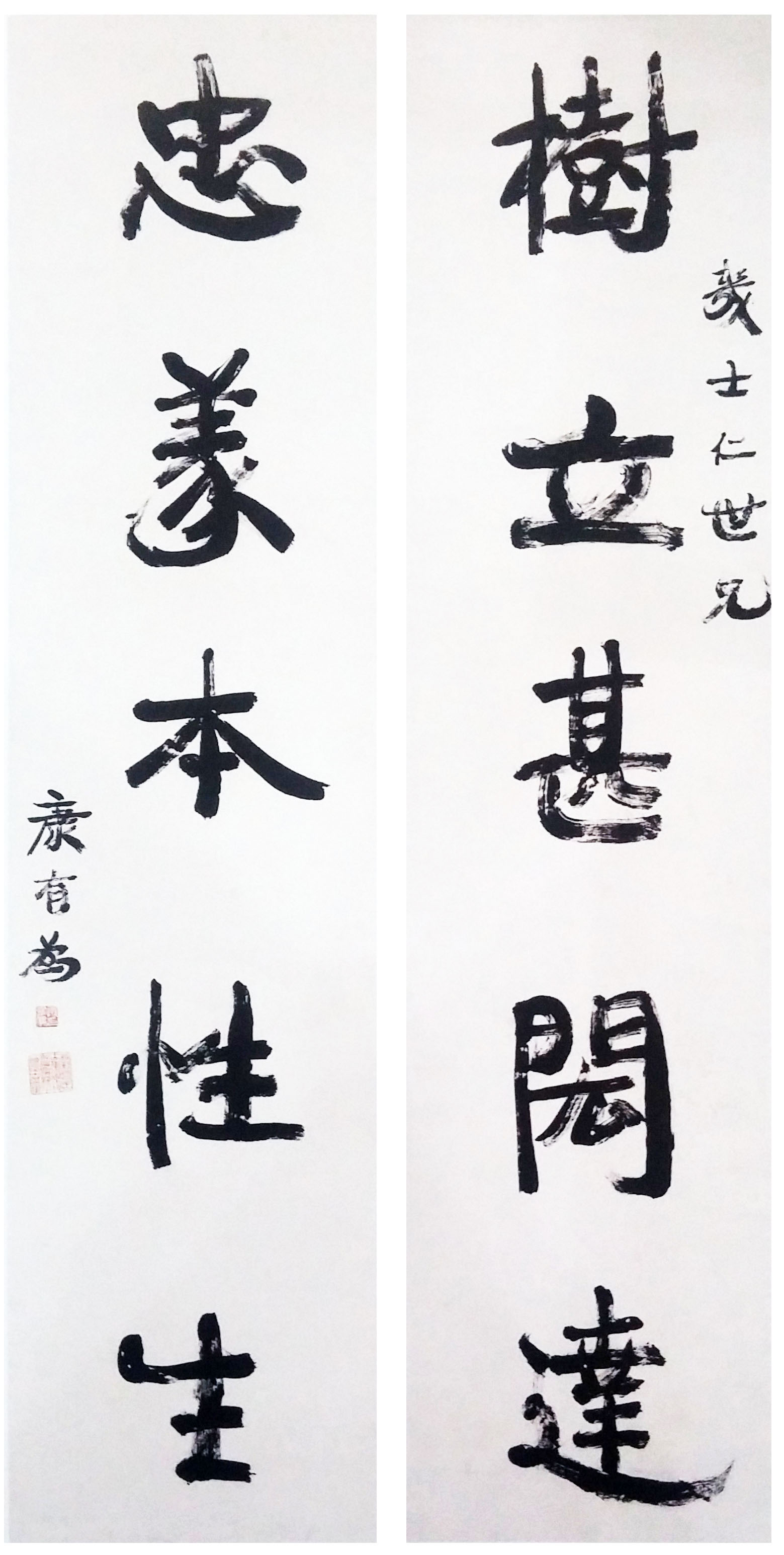 康有为《行书“树立忠义”五言联》 纸本行书 130cm×31.5cm×2 福建博物院藏 释文:树立甚闳达,忠义本性生。几士仁世兄。康有为。 【资料来源】《福建博物院书画藏品选粹》(文物出版社)