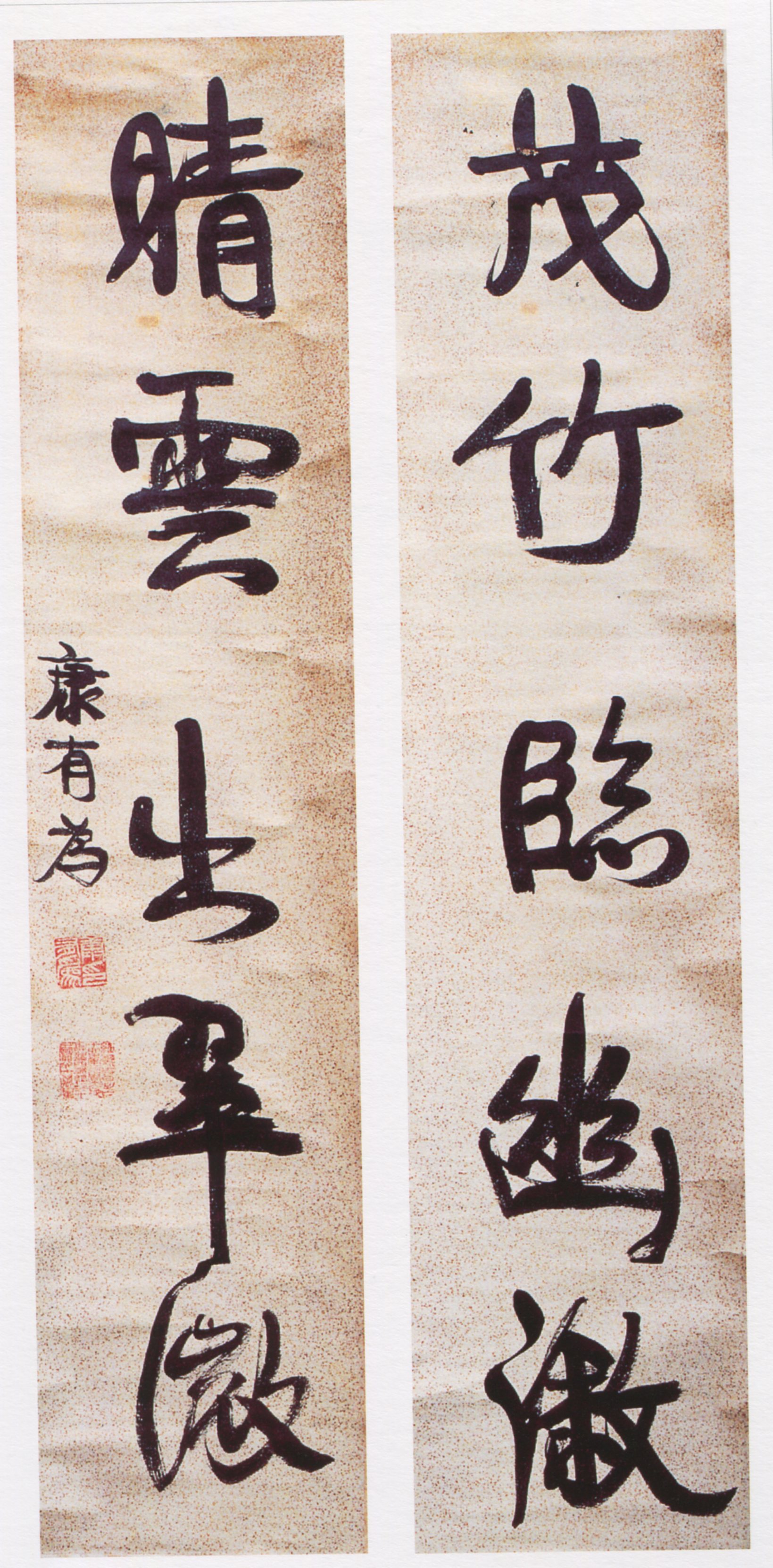康有为《行书茂竹晴雲五言联》纸本行书 126×32.5cm×2 浙江省余杭博物馆藏 释文:茂竹临幽溆,晴雲出翠微。 款署:康有为 钤印:康有为印(白文)等 【资料来源】《余杭博物院藏馆藏文物精品选-书画卷》(中国文化艺术出版社)