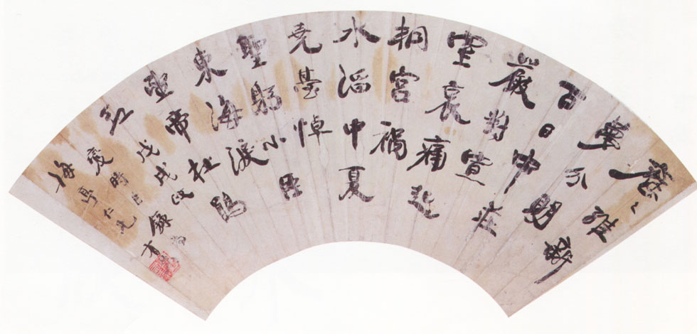康有为《行书戊戌八月国变记事诗扇》纸本行书 50.5×16.7cm 1898年 广州艺术博物院藏 释文:历历维新梦,分明百日中。庄严对宣室,哀痛起桐宫。祸水滔中夏,尧台悼圣躬。小臣东海泪,望帝杜鹃红。 款署:戊戌政变时作,录为海亭仁兄,有为。 钤印:康有为印(白文) 【资料来源】《天海高旷 水月清华——康有为梁启超书法展》 (广州艺术博物院2018.9.9-12.10)