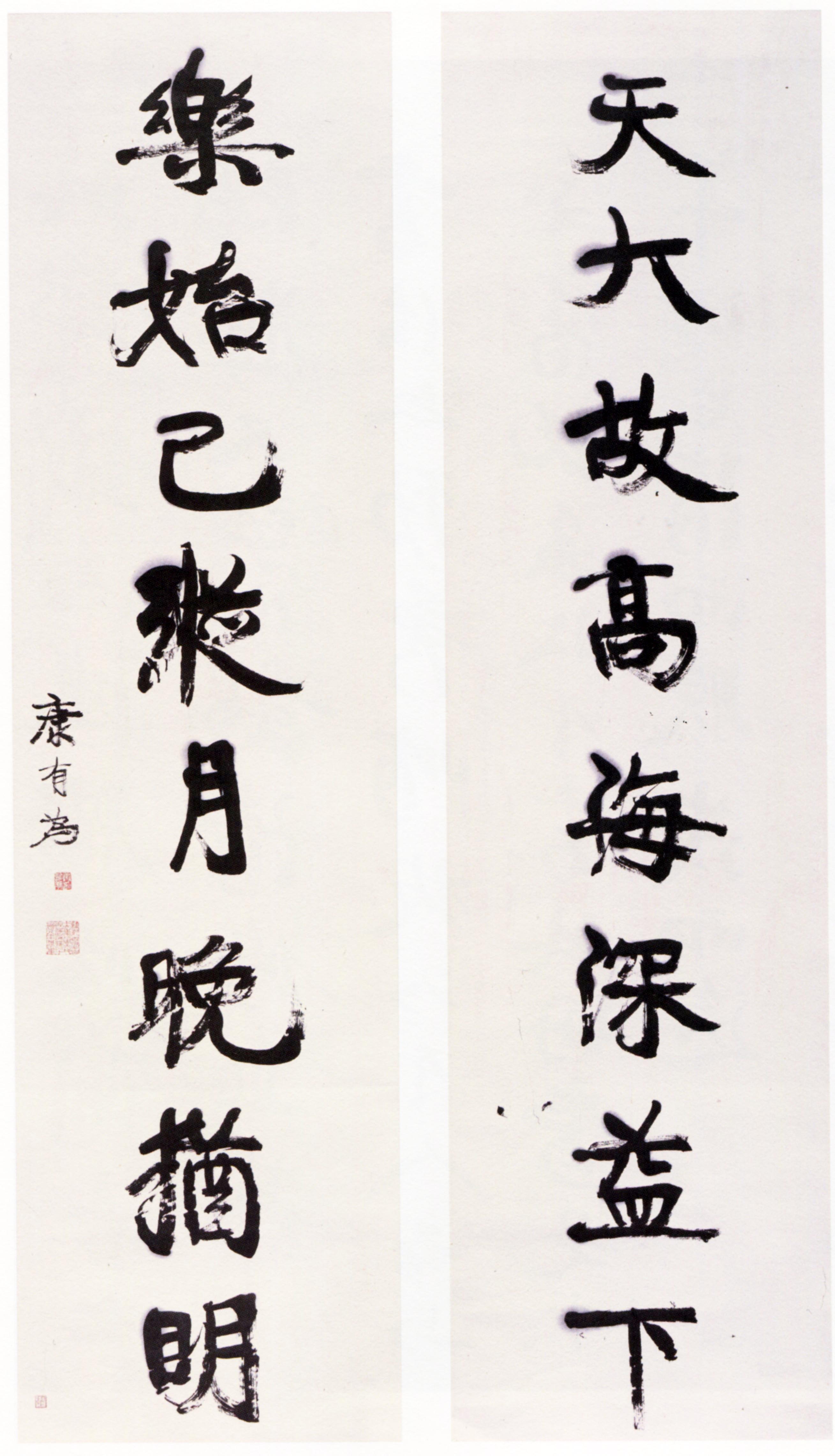 康有为《行书天大乐始八言联》纸本行书 148.3×39.4cm×2 广州艺术博物院藏(容庚先生捐赠) 释文:天大故高海深益下,乐始已纵月晚犹明。 款署:康有为。 钤印:康有为印(白文)、维新百日出亡十六年三周大地游遍四洲经三十一国行六十万里(朱文) 【资料来源】《天海高旷 水月清华——康有为梁启超书法展》 (广州艺术博物院2018.9.9-12.10) 墨韵文脉——广州艺术博物院藏明清书画精品展(中国美术馆 2024-11-09至2025-02-16)