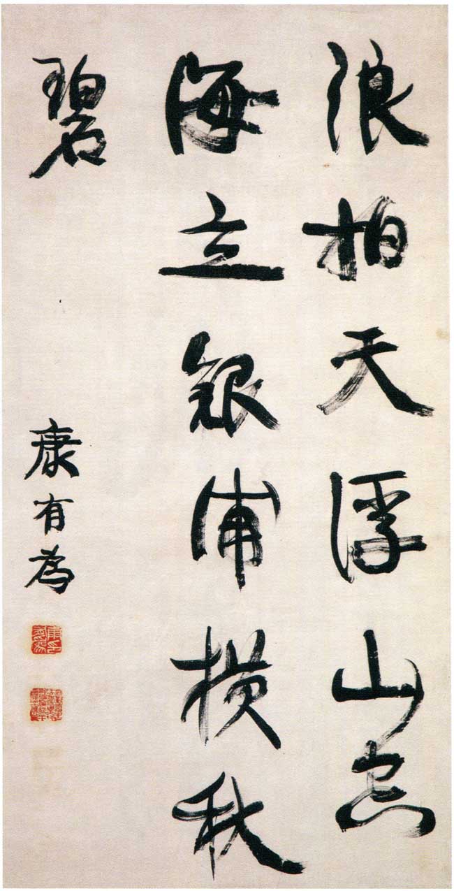 康有为《行书张炎壶中天句轴》纸本行书 87×58.3cm 广东省博物馆藏 释文:浪拍天浮,山空海立,银浦横秋碧。 款署:康有为。 钤印:康有为印(白文)、维新百日出亡十六年三周大地游遍四洲经三十一国行六十万里(朱文) 【资料来源】《天海高旷 水月清华——康有为梁启超书法展》 (广州艺术博物院2018.9.9-12.10)