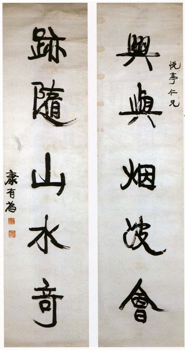 康有为《行书兴与迹随五言联》纸本行书 163×41.3cm×2 广东省博物馆藏 释文:兴与烟波会,迹随山水奇。 款署:悦亭仁兄。康有为。 钤印:康有为印(白文)、维新百日出亡十六年三周大地游遍四洲经三十一国行六十万里(朱文) 【资料来源】《天海高旷 水月清华——康有为梁启超书法展》 (广州艺术博物院2018.9.9-12.10)