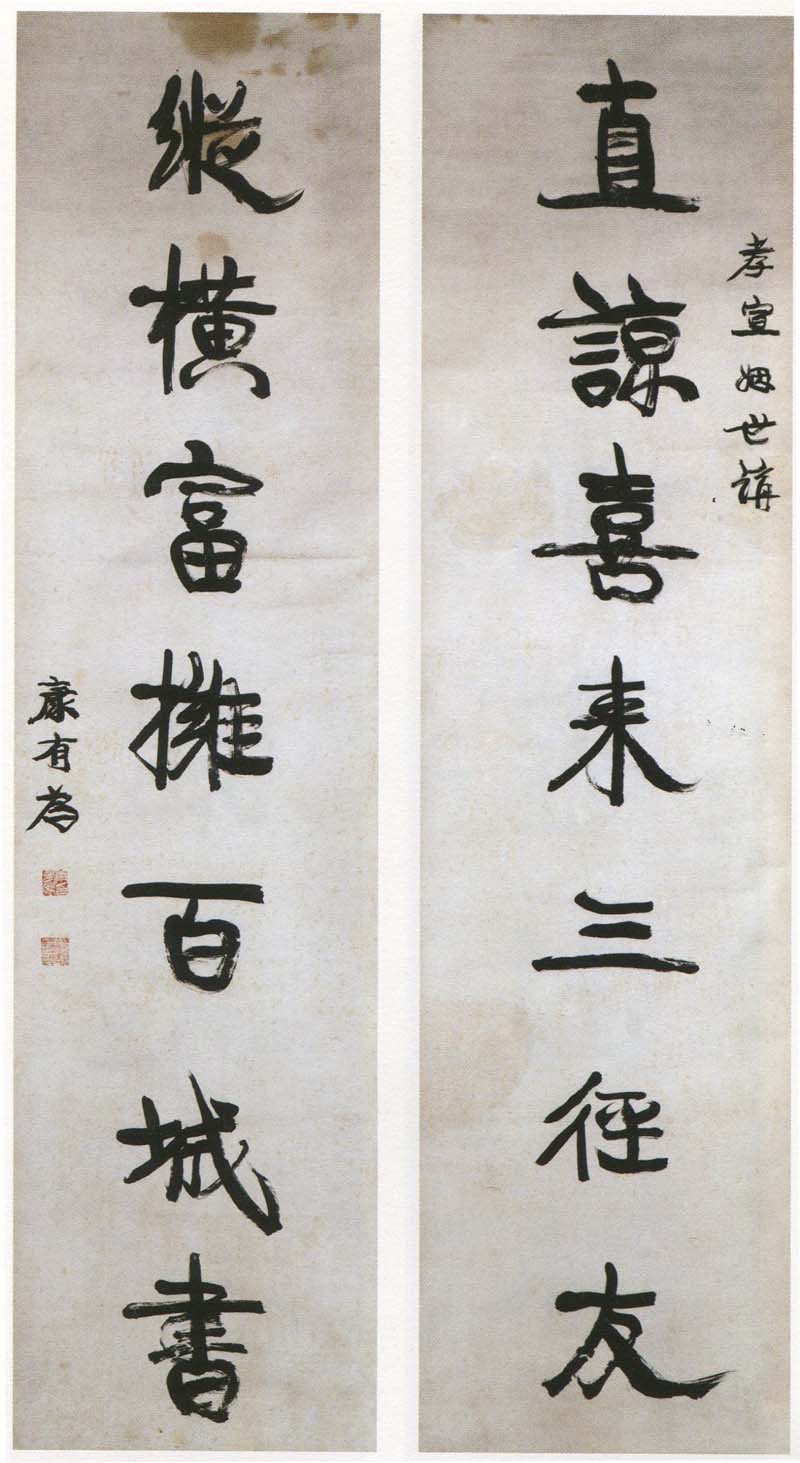 康有为《行书直谅纵横七言联》纸本行书 174.5×45.5cm×2 广东省博物馆藏 释文:直谅喜来三径友,纵横富拥百城书。 款署:孝宣姻世讲。康有为。 钤印:康有为印(白文)、维新百日出亡十六年三周大地游遍四洲经三十一国行六十万里(朱文) 【资料来源】《天海高旷 水月清华——康有为梁启超书法展》 (广州艺术博物院2018.9.9-12.10)