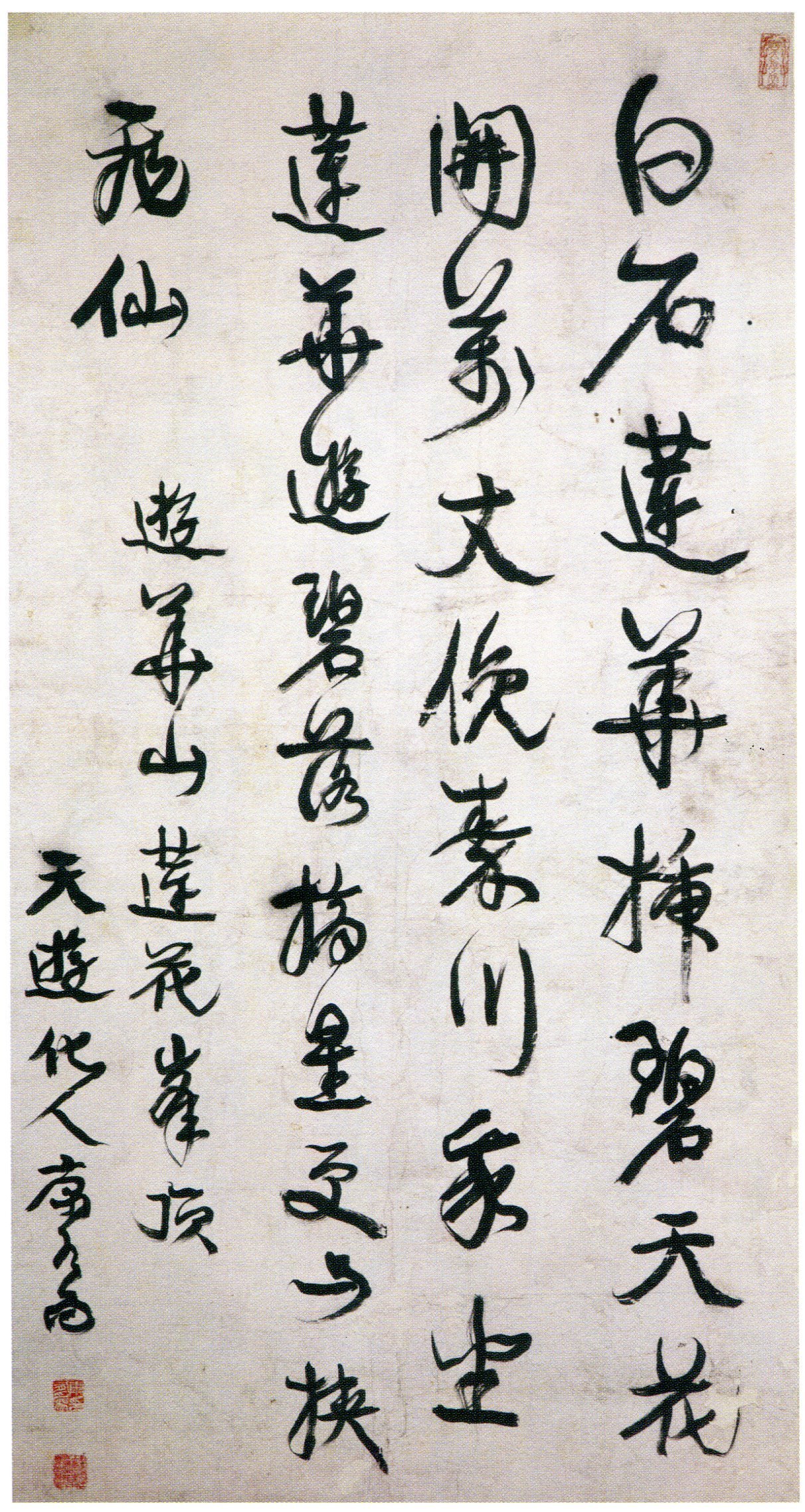 康有为《行书游华山莲花峰顶诗轴》纸本行书 145×76.5cm 广东省博物馆藏 释文:白石莲花插碧天,花开万丈俯秦川。我坐莲花游碧落,摘星更与挟飞仙。 款署:游华山莲花峰顶。天游化人康有为。 钤印:康有为印(白文)、维新百日出亡十六年三周大地游遍四洲经三十一国行六十万里(朱文) 【资料来源】《天海高旷 水月清华——康有为梁启超书法展》 (广州艺术博物院2018.9.9-12.10)