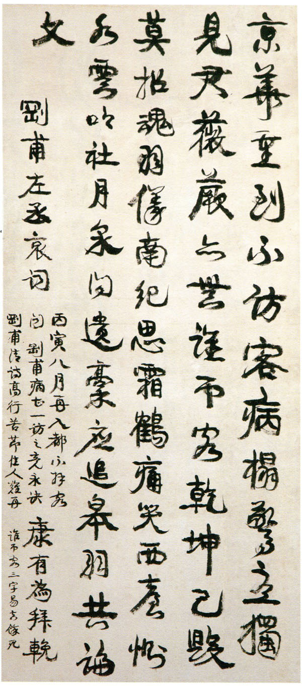 款署:刚甫左丞哀词。丙寅八月再入都,不拜客,闻刚甫病甚,一访之,竟永诀。刚甫清诗高行苦节,佳人难再。康有为拜輓。(“谁吊客”三字易“真饿死”。)