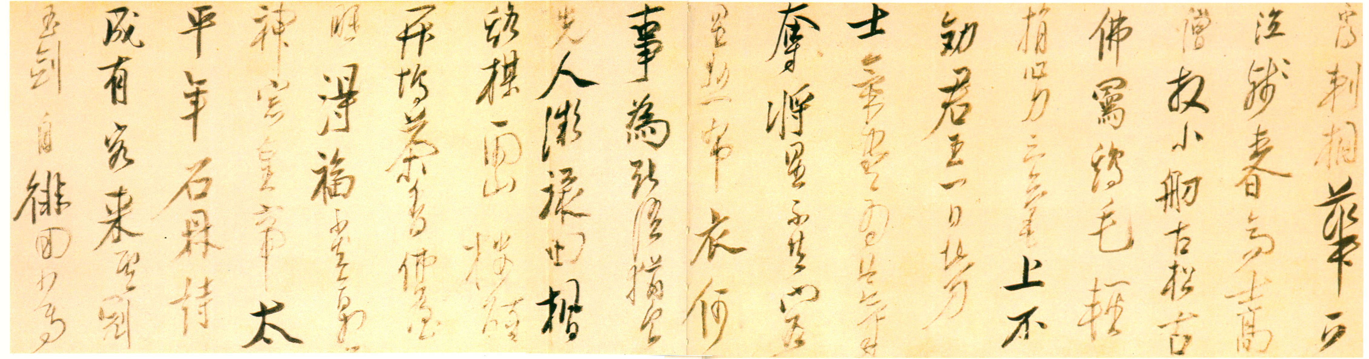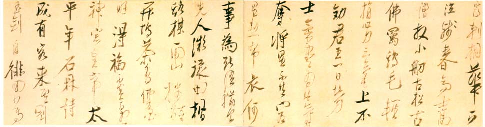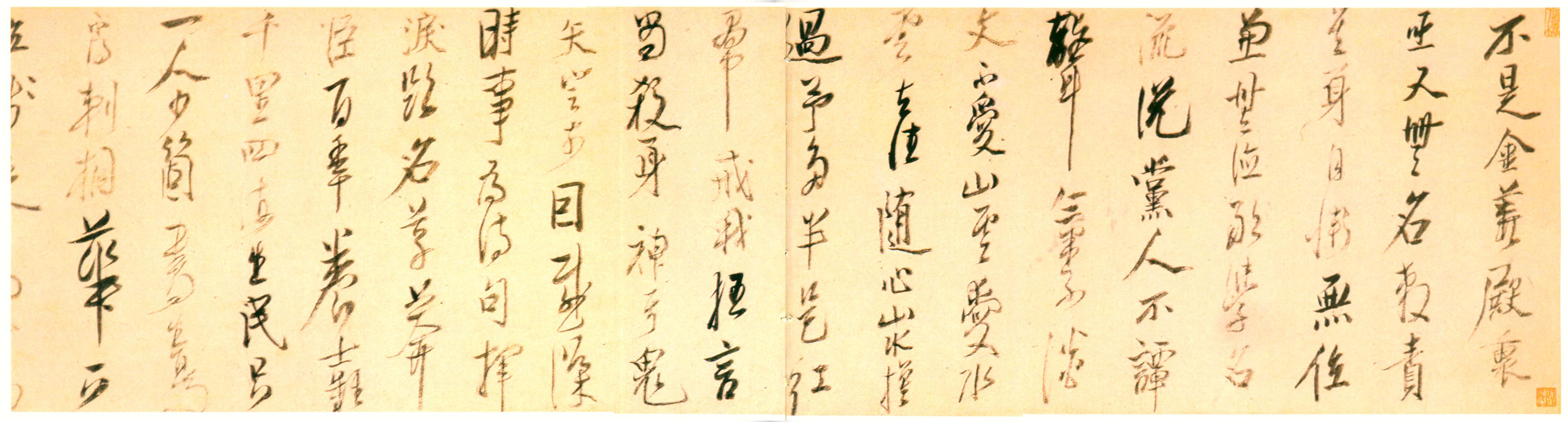 《行草诗卷》局部 卷轴装,上海图书馆藏。纸高20·5CM,通卷长355·5CM。此乃 其书赠友人七言长诗,末署“洪绶书拟”,钤有“陈氏洪绶”印记。