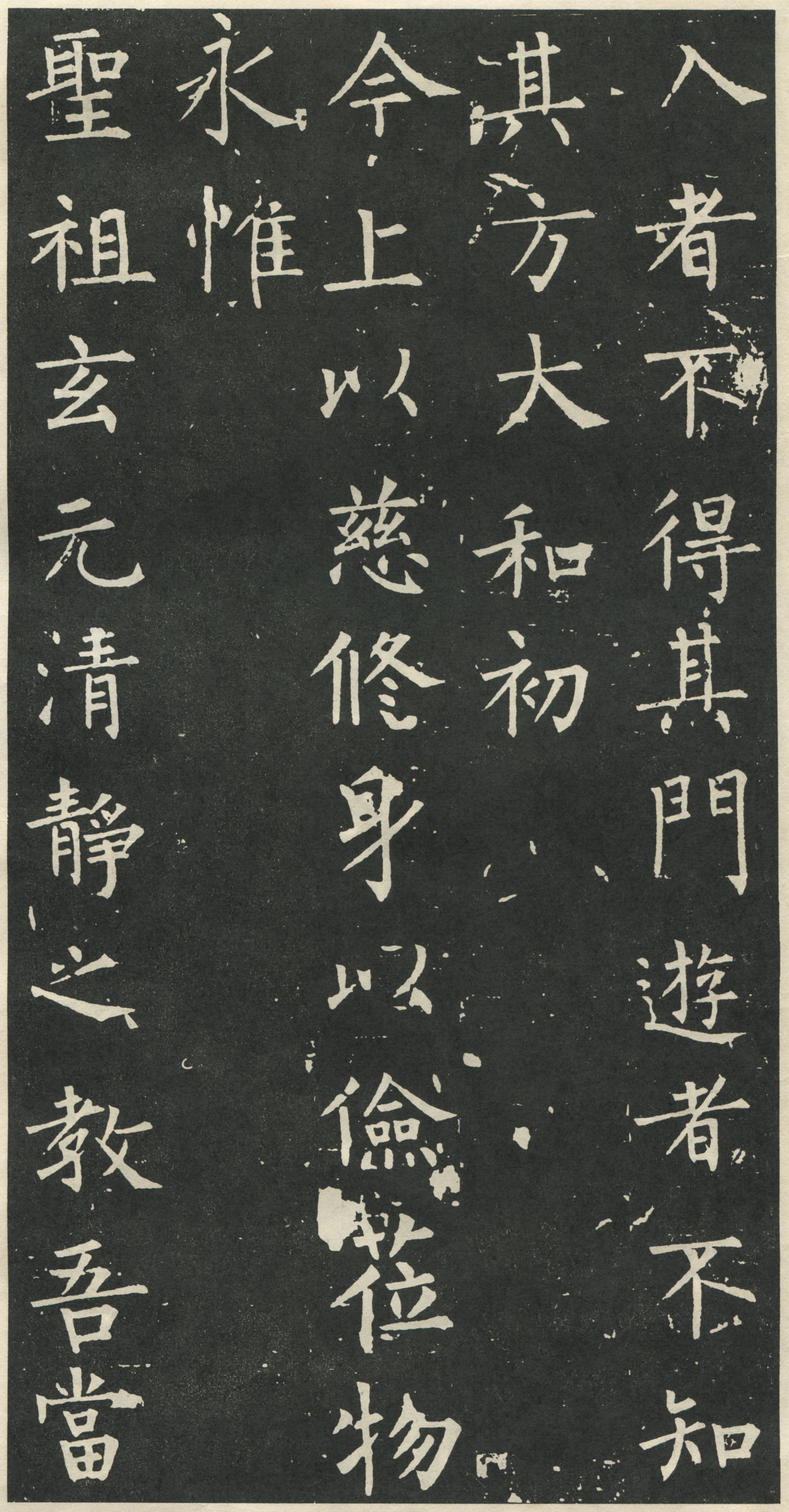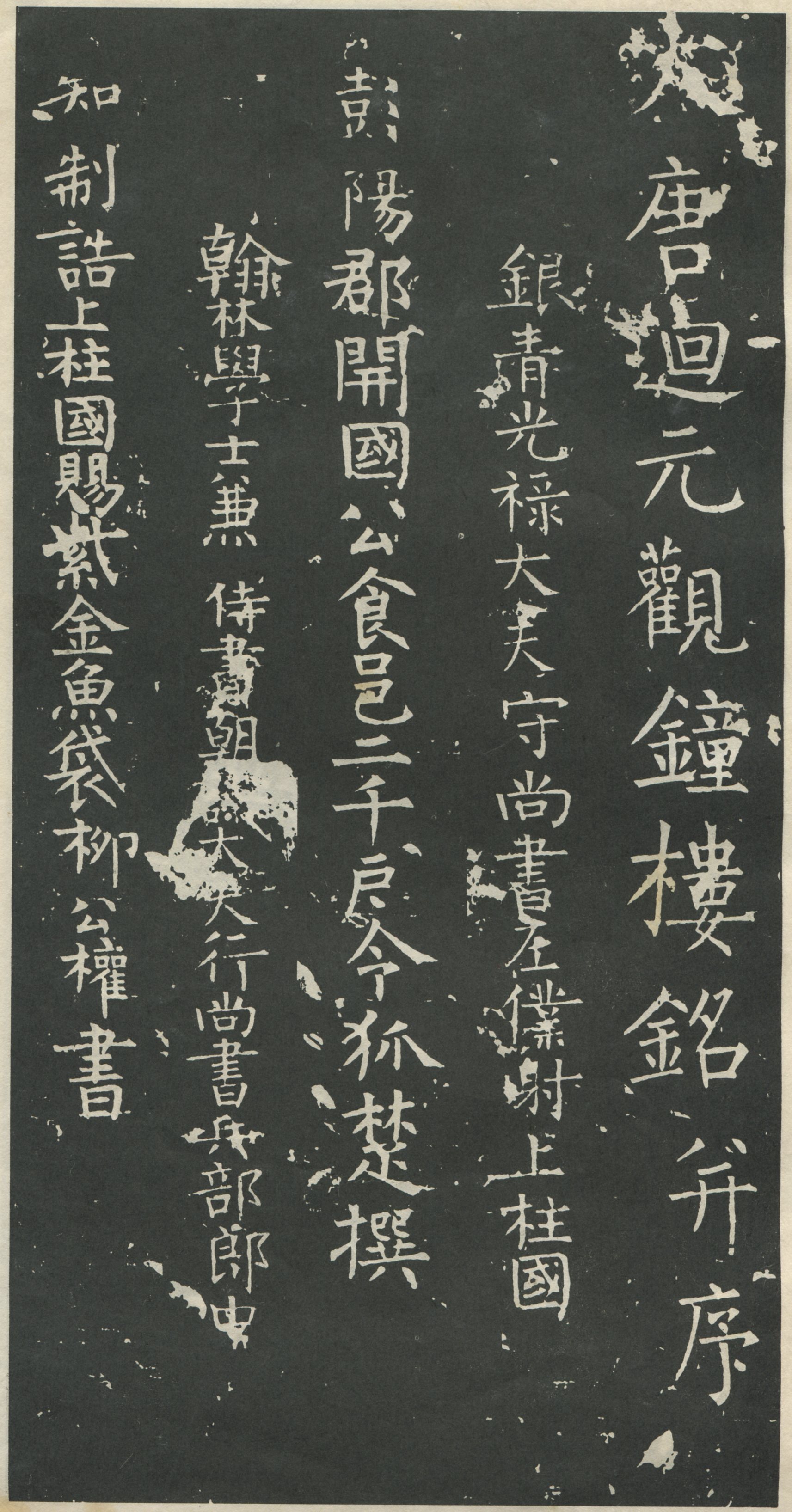 《迴元观钟楼铭》碑是柳公权58岁时所书,也是现存柳碑中最完整的。此碑风神烁烁,一笔不苟,其用笔重骨力,以方笔为主,辅以圆笔,劲利清健。其结构往往错位中求变化,比如左右结构的字“蹲”、“钟”、“楼”等将左边偏旁往上挪,形成左短右长的结字法,在不平衡中求韵趣。