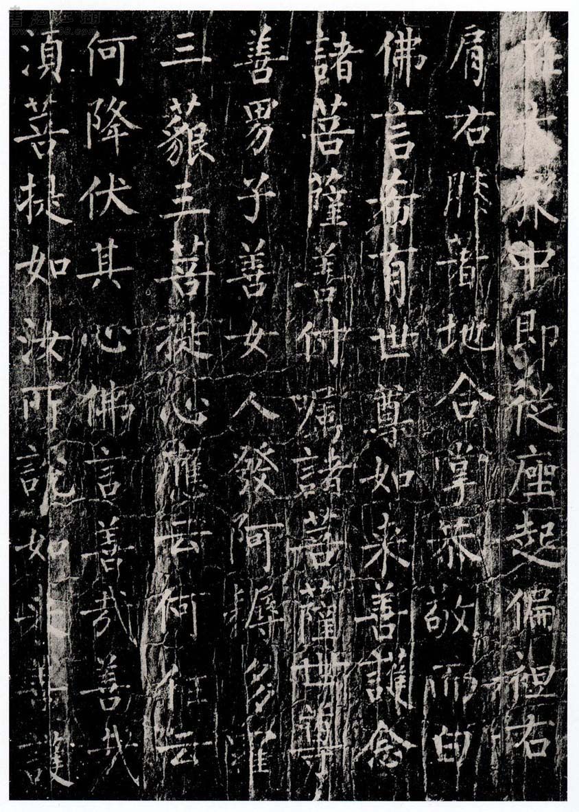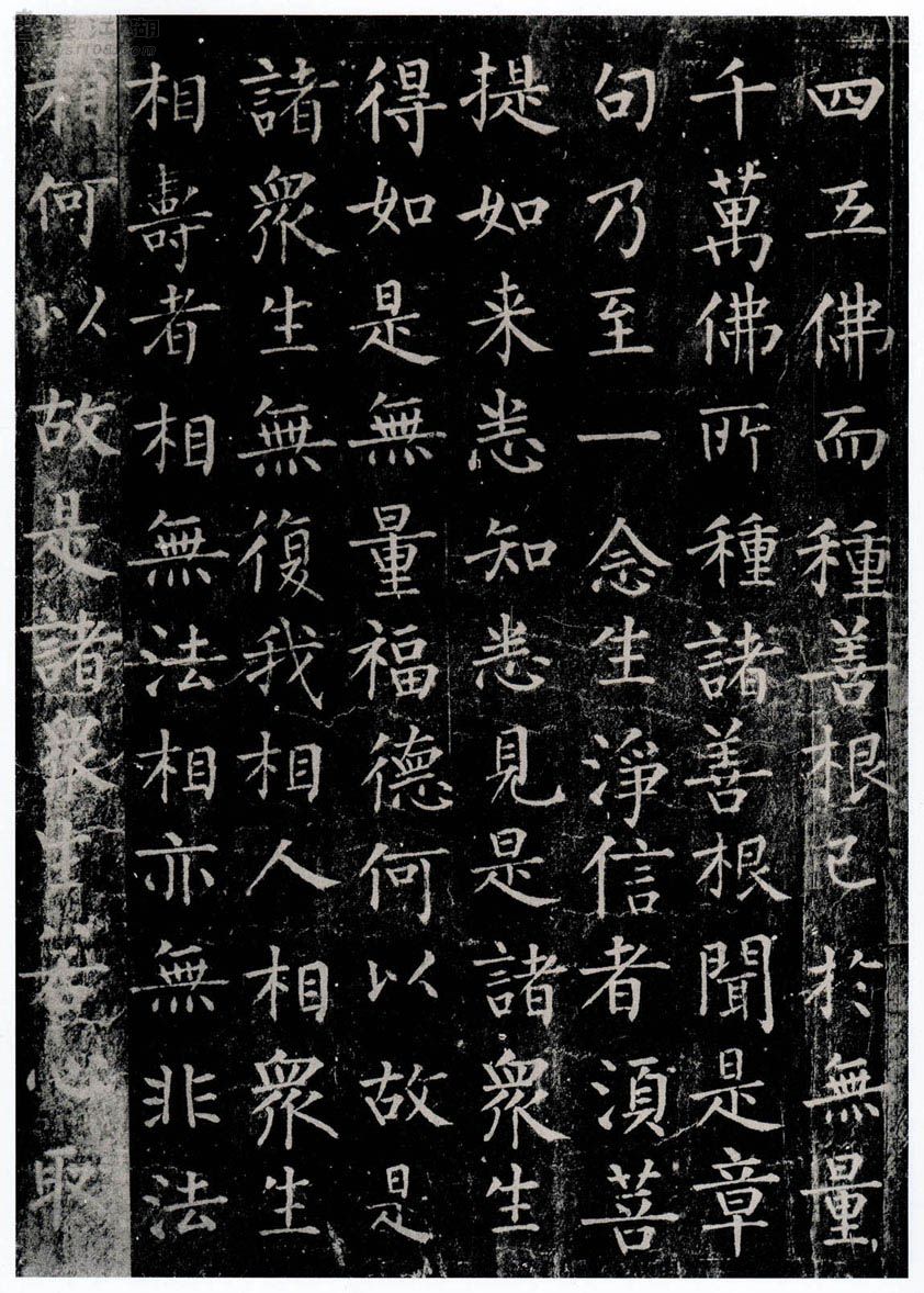 《金刚经》为柳公权早期作品,字不大但用笔灵巧劲健,虽多有与“颜书”同法之处,但明显地摒弃了“蚕头雁尾”的用笔之法,而多融入魏晋及初唐楷意,并掺之以北碑的骨力洞达,故初观此碑似觉平常,颇有剑拔弩张之势,然细察之则一招一式颇富变化,方劲整饬中寓清灵通秀之气,其一点二画,一如刀斫般齐整,干脆利落,节奏明快,极富动感。故而人们将“柳体”的特征概括为:精于点画、谨于间架、法度森严而富宙堂气象。于此碑可见一斑。