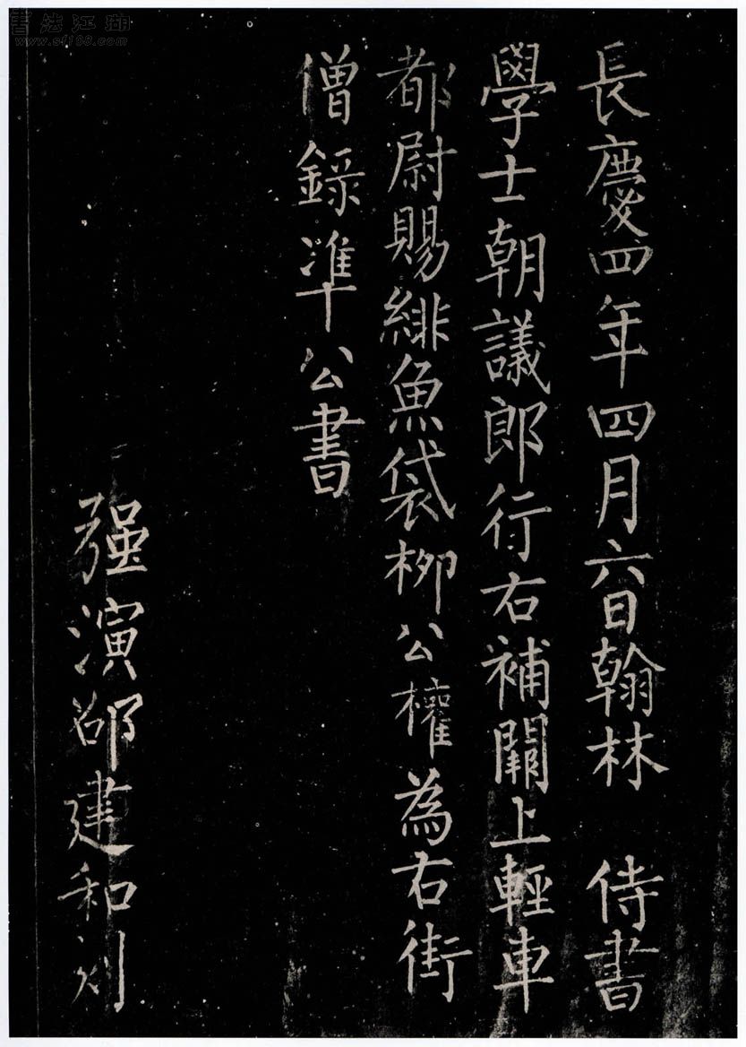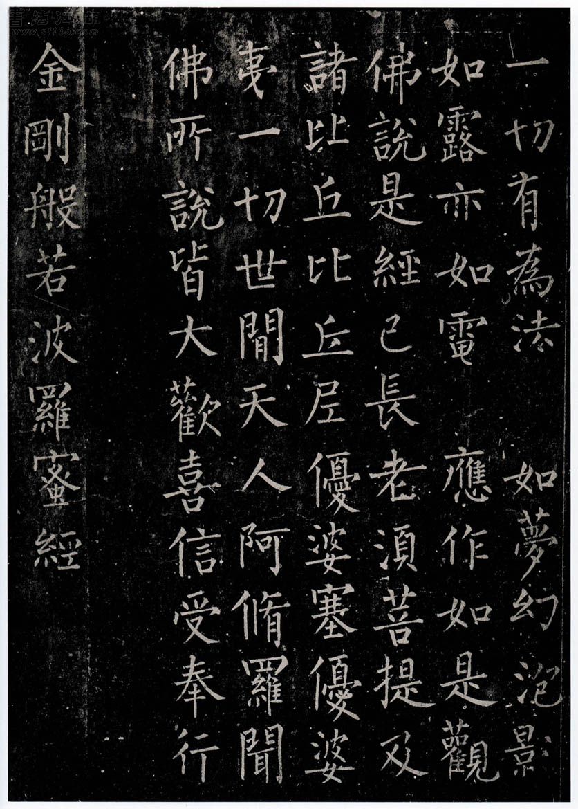 《金刚经》刻于唐长庆四年(824)四月,系柳公权四十七岁时所作,全称《金刚般若波罗蜜多经》,为右街僧录准公书。原石早佚,1908年在敦煌石窟发现唐拓孤本,一字未损,极为稀罕,现藏法国巴黎博物院。上海有正书局、文明书局、中华书局、文物出版社均有影印本行世。
