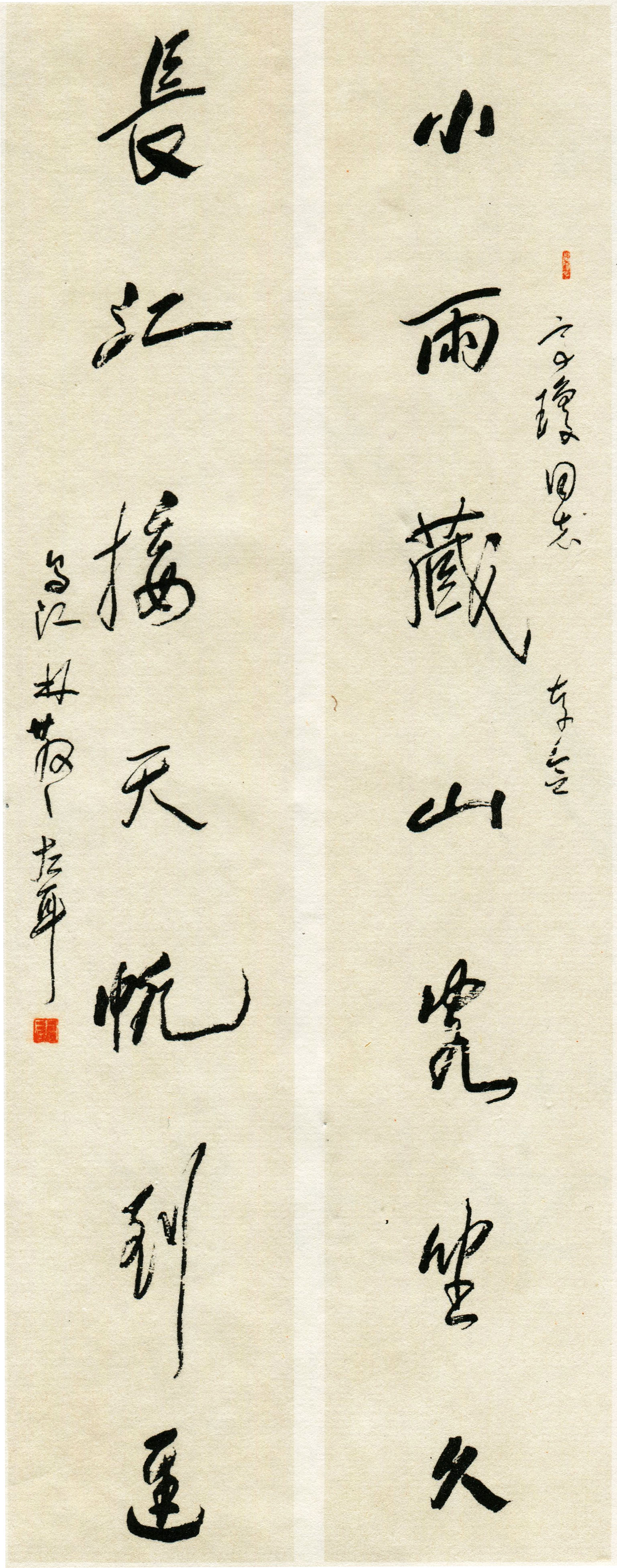 林散之《行书小雨长江七言联》纸本行书 138×23.5cm×2 1954年 马鞍山林散之艺术馆藏 释文:小雨藏山客坐久,长江接天帆到迟。 款署:高琼同志存念, 乌江林散之左耳。 钤印:左耳(白文)