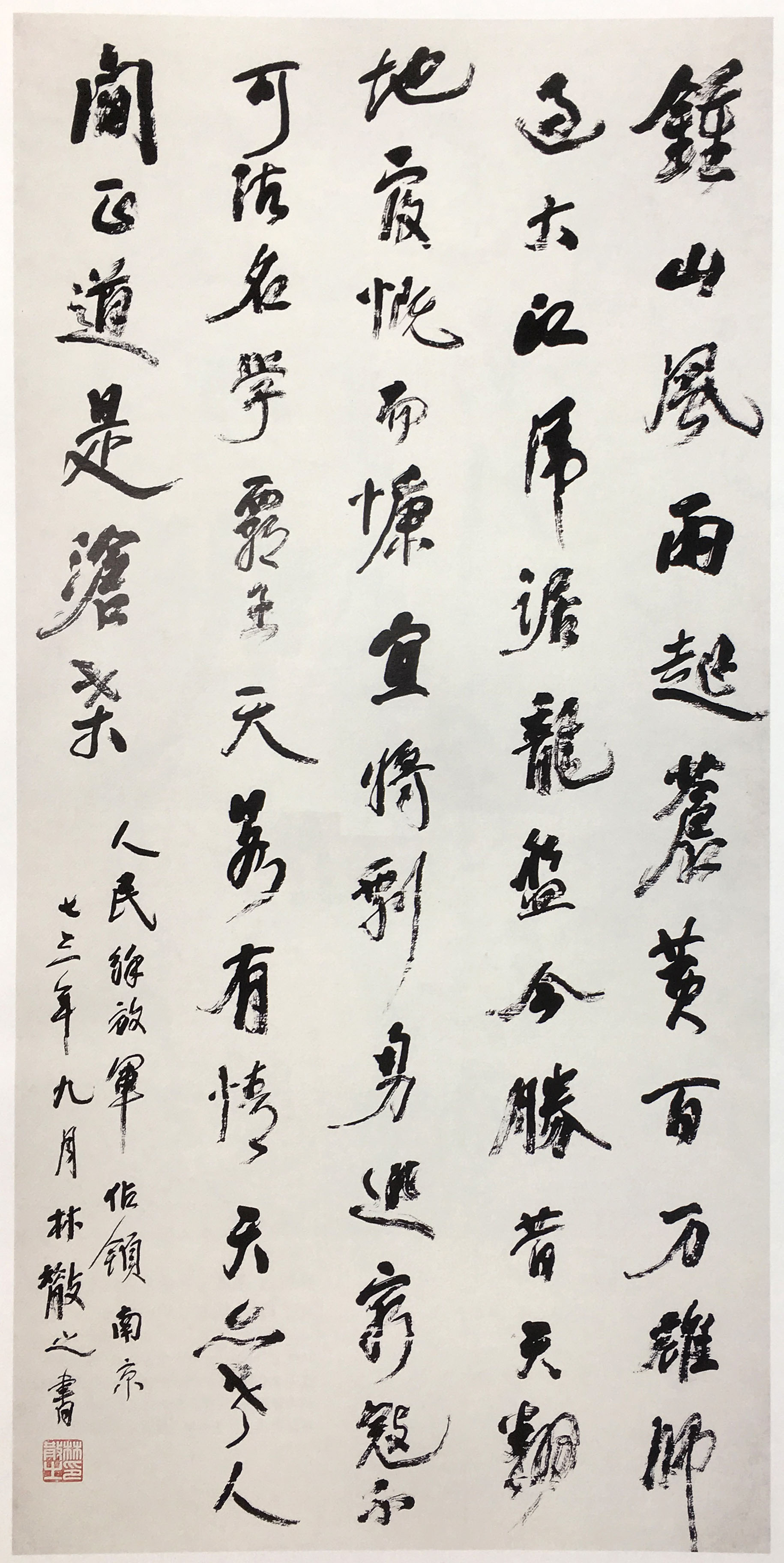 林散之《行书毛泽东七律人民解放军占领南京诗轴》纸本行书 300×150cm 1973年 江苏省美术馆藏 释文:钟山风雨起苍黄,百万雄师过大江。 虎踞龙盘今胜昔,天翻地覆慨而慷。 宜将剩勇追穷寇,不可沽名学霸王。 天若有情天亦老,人间正道是沧桑。 款署:人民解放军占领南京,七三年九月,林散之书。 钤印:林散之印(白文)