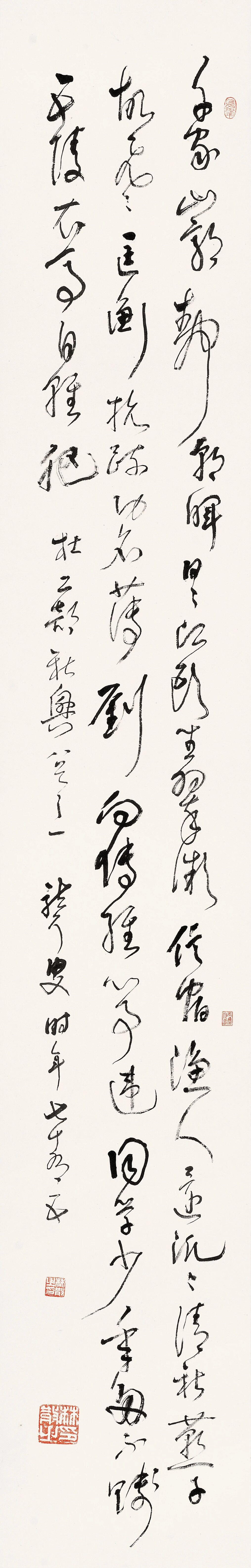 林散之《草书杜甫诗秋兴八首之三诗轴》 137×22cm 1972年 宋玉麟食砚斋藏 释文:千家山郭静朝晖,日日江楼坐翠微。信宿渔人还泛泛,清秋燕子故飞飞。匡衡抗疏功名薄,刘向传经心事违。同学少年多不贱,五陵衣马自轻肥。 款署:杜工部秋兴八首之一。聋叟,时年七十有五。 钤印:长年(朱文)、林散之印(白文)、林散之印(白文) 鉴藏印:玉麟珍藏(朱文)