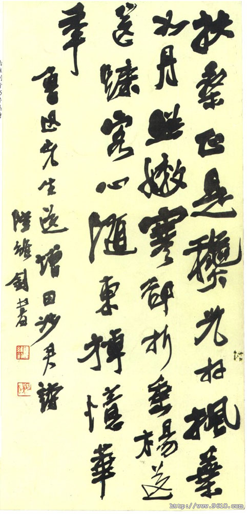 释文:扶桑正是秋光好,枫叶如丹照嫩寒。却折垂杨送归客,心 随东棹忆华年。鲁迅先生送增田涉君诗,陆维钊书。